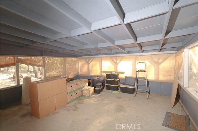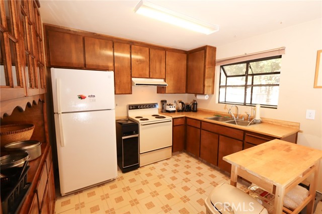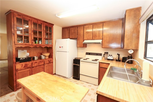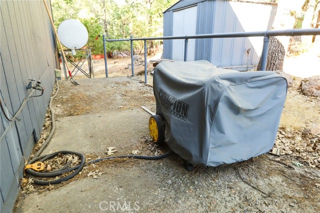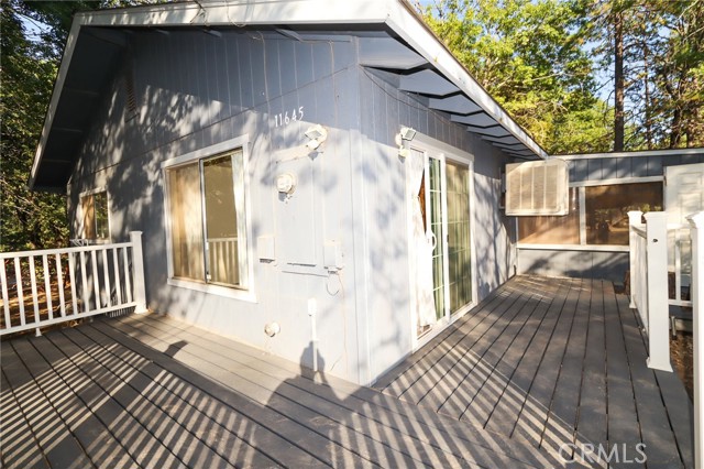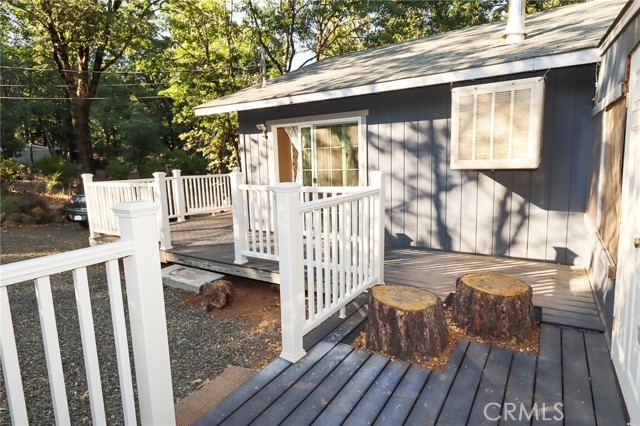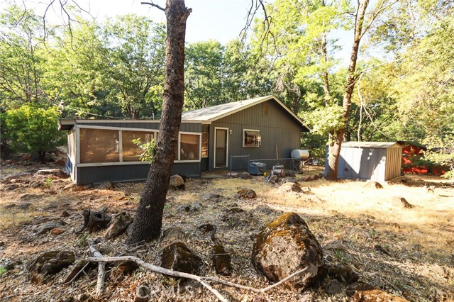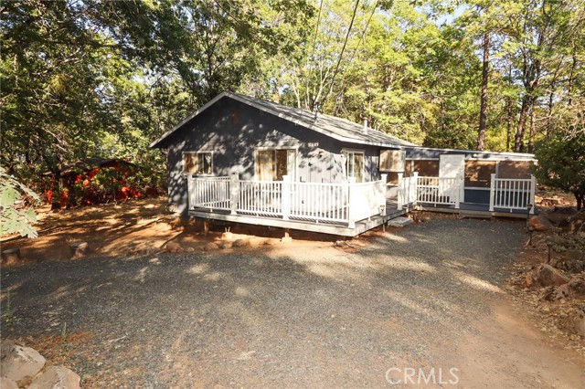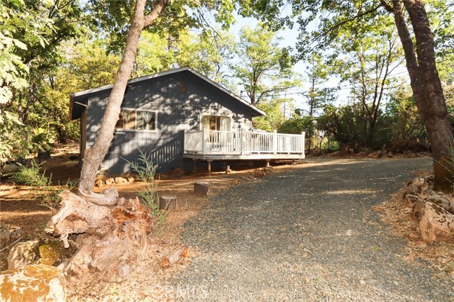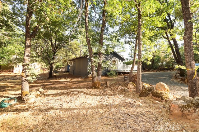 THE PERFECT STARTER HOME on a mostly level double lot of a third of an acre, with lots of room for additional building, parking, gardening or pets. The home is very tidy and move-in ready, with minimal steps and a woodstove, as well as an efficient Monitor heater, built in wooden hutch, butcher block island and a large living room opening through sliding glass doors onto a wrap-around composite deck. Large closed-in porch of about 400 sf for extra activities or just storage. The property is fire safe with lovely oak trees in this beautiful forested area and is on a corner parcel for easy circular driveway access. There is also a shed and a generator included.