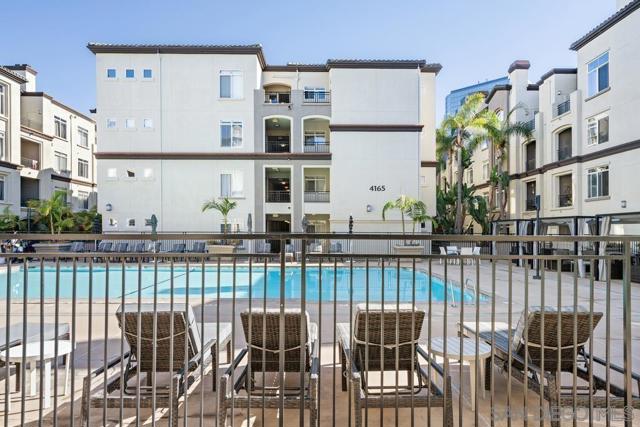 Rarely for sale! This naturally bright and spacious condo has engineered wood floors, 9-ft ceilings, crown molding, new paint and newer laundry machines. The roomy balcony overlooks swimming pool. Best location in the complex! Granite countertops and stainless steel appliances; wrap-around breakfast bar. TWO gated assigned underground parking. Near beaches, premier shopping, dining, UCSD, hospitals, and UTC mall. Easy access to MTS bus, Trolley, I-5, 805 and 56.