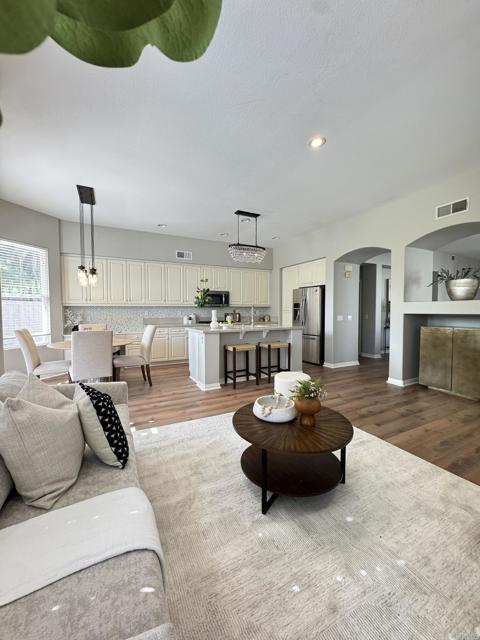 Back on Market with striking NEW FLOORS! *** It's a Beauty! The ease of ONE-STORY LIVING! .17 Acres.*** A great floor plan with a private primary Bedroom SUITE including walk-in closet, plus mirrored slider closet, separate tub and large shower, with direct access to the patio (a perfect spot for a spa). *** An amazing KITCHEN with built-in desk, 5-burner cooktop, and Convection oven...eat/visit from a built-in counter as well as the kitchen's ample eating area, all OPEN to the FAMILY ROOM where the marble fireplace accents the room-of-entertainment along with the well-sized niche. *** Tantalizing lighting shimmers elegantly throughout the home. *** Don't forget the LAUNDRY room filled with ample cabinetry plus, LG washer & dryer! *** Add to the FUN with the friendly neighbors, walking trails, play areas, and the beautiful refreshing pool. What's not to love, when it's a WOW HOUSE?