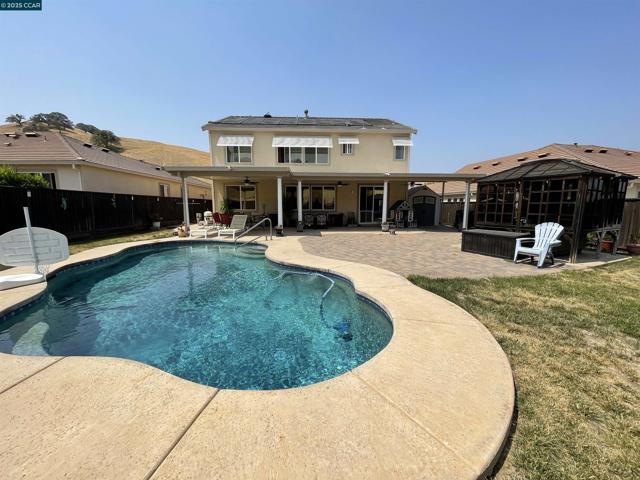 Don’t miss this opportunity! Spacious 5 bedrooms 3 baths located on cul-de-sac with gorgeous views of hills and no rear end neighbors. Move-in ready with high ceilings, granite kitchen, and cozy fireplace Enjoy hill views, a sparkling pool, hot tub, pergola, and no rear neighbors. Paid-off solar system, water heater, and pool heating included. This home is a good condition, move in ready, lots of upgrades and amenities: high ceilings, very open and bright floor plan with warm accent walls, gourmet kitchen with granite island and large open family area, beautiful cabinetry, family room with a cozy fireplace. Great views from the family room of the gorgeous hills, beautiful swimming pool, pergola, hot tub, stamped concrete patio, brand new patio covering and lush green lawn for family fun and entertaining. No rear neighbors. Solar system, solar water heater, Solar pool heater paid off. Open House Saturday Feb 28 1-4pm