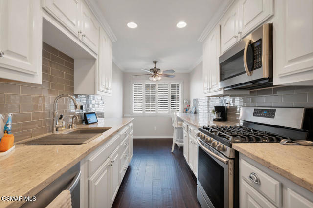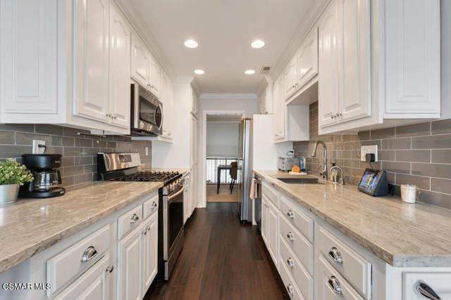 Welcome to 6217 1/2 Nita Ave.! - a beautifully upgraded 3-bedroom, 3-bathroom townhome offering 1,518 sq ft of stylish, move-in ready living space in highly desirable Woodland Hills. Step into the light and bright floorplan featuring wide plank bamboo flooring, recessed lighting, crown molding and dual-pane windows with elegant plantation shutters throughout. The inviting living room showcases a stunning stacked limestone fireplace and sliding glass doors that open to a private brick patio--perfect for relaxing or entertaining. Enjoy the fully renovated kitchen boasting crisp white cabinetry, granite countertops, stainless steel appliances and a convenient breakfast bar/built-in desk area. Upstairs, the generous primary suite offers a walk-in closet, charming window seat and ensuite bathroom complete with quartz countertops, a dedicated vanity area, marble-accented tile and sleek frameless glass shower doors. Two additional well-sized bedrooms, two beautifully updated full guest bathrooms as well as a direct-access two-car garage with laundry hook-ups complete the home. This gorgeous, turnkey property combines modern upgrades with timeless charm--don't miss your chance to make it yours!