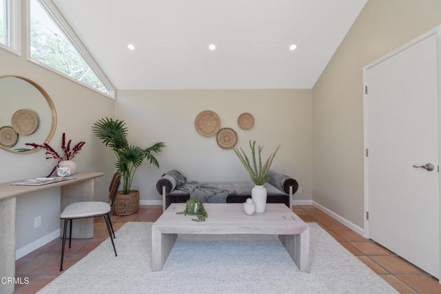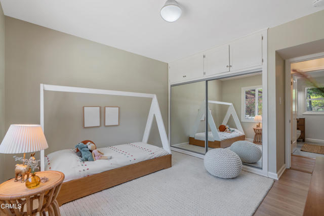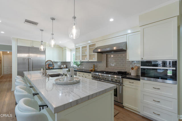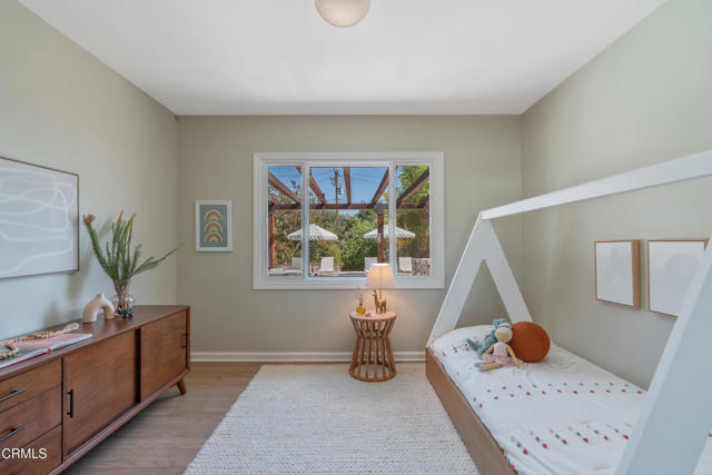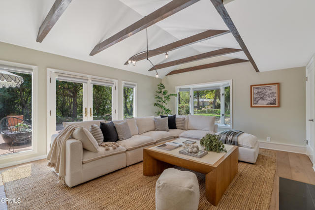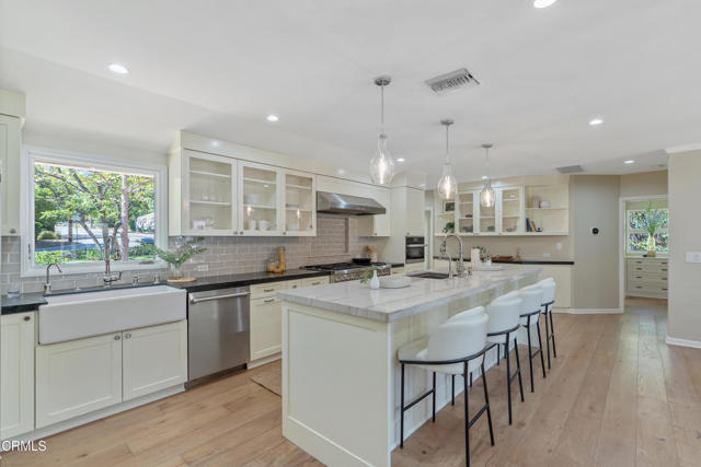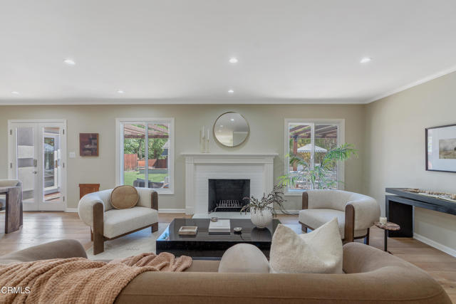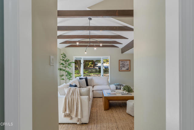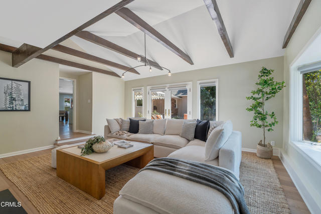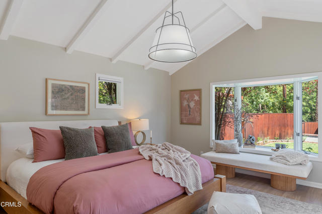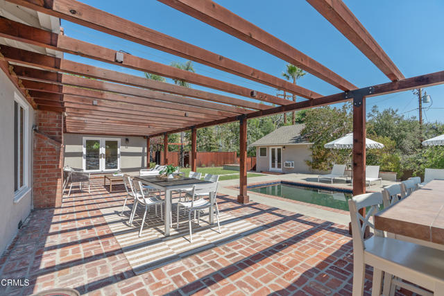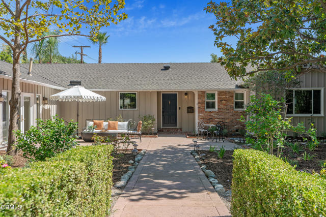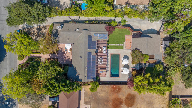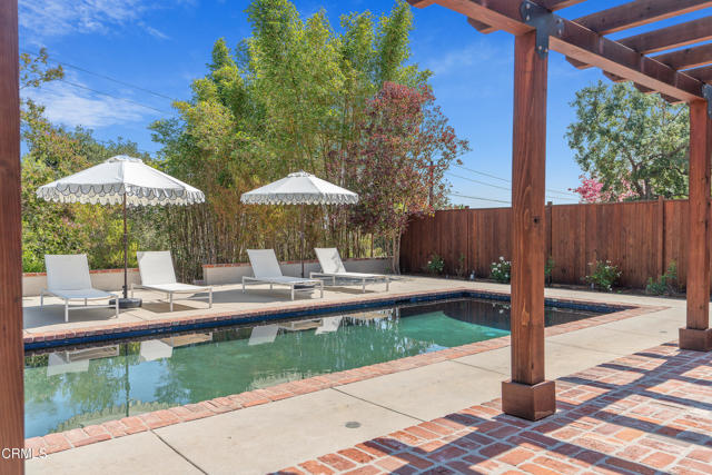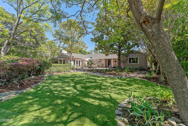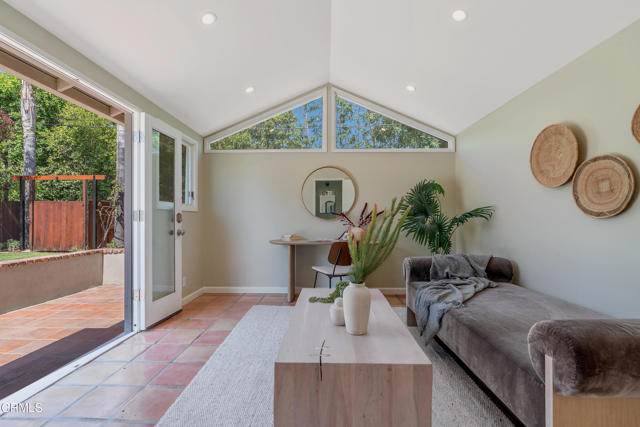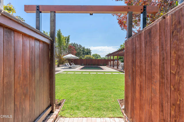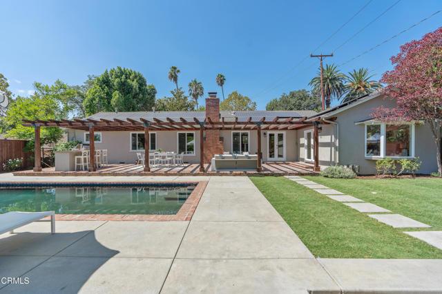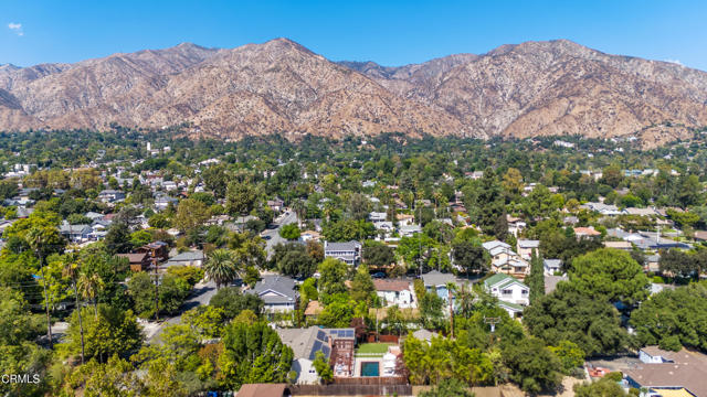 This updated Mid-Century Ranch feels completely tucked away on an idyllic, tree-lined street, despite its close proximity to charming downtown Sierra Madre. The home's layout is intuitive for a small crowd keen on entertaining. The open-concept great room shows off views of the serene yard with its sparkling pool, a brick fireplace, crown moulding, and recessed lighting. The bright, open-air kitchen is lined with custom solid wood cabinets, dovetail and soft-close drawers, a suite of Thermador appliances, a wine fridge, and a Miele steam oven. Just off the kitchen, you can keep everything organized in the walk-in pantry and the handsomely appointed laundry room. The south side of the home includes three spacious bedrooms, all filled with natural light, and two 3/4 baths. The north side of the home offers a bonus room with vaulted ceilings, a closet, a fireplace, and a half bath, which could easily function as a secondary suite. The primary suite boasts dual sinks, a freestanding tub, a truly incredible amount of closet space, vaulted ceilings, and glass French doors that lead out to the back patio. The primary suite and the great room open up to the expansive backyard, offering you that coveted indoor-outdoor flow that's as ideally suited for entertaining as it is for quiet contemplation. Spill out onto the pergola-covered brick patio with its built-in gas BBQ and mini fridge, take advantage of the flat lawn, play in the black bottom pool, and rinse off in the cabana's 3/4 bath. The split-level backyard offers even more space for you to get creative, perhaps with gardening beds, a playground, or both. The home has seen many updates, including remodeled baths and kitchen, new floors, doors, and windows, updated pool equipment, a whole home generator, a tankless water heater, and more. 180 S Mountain Trail shows off clear views of the San Gabriel mountains, with a setting that puts you just minutes away from local favorites like Syndicate, Emmi's, Lucky Baldwin's, Wistaria, and the Buc, as well as parks, the Mount Wilson Trail, the Arboretum, Santa Anita Park, and Westfield Santa Anita.