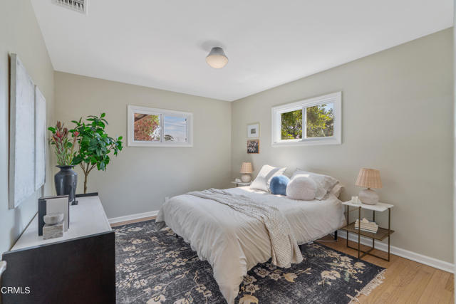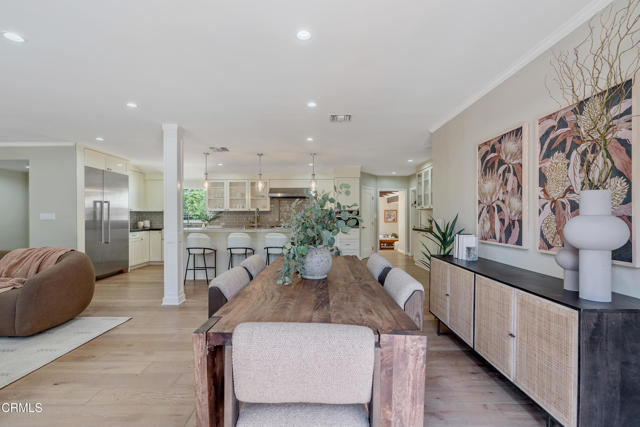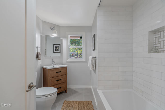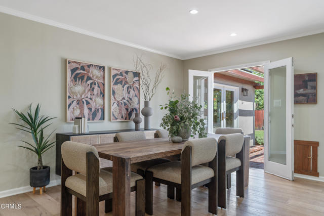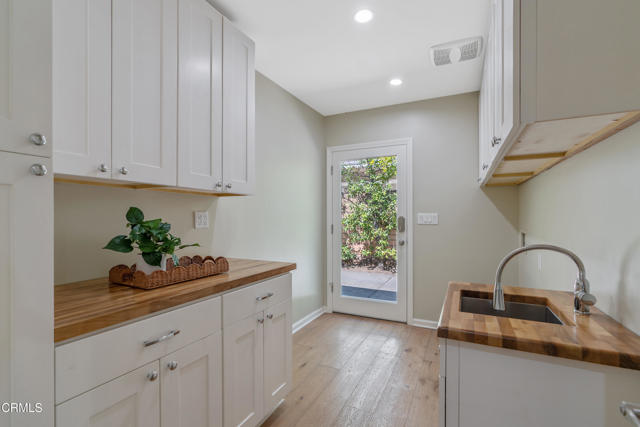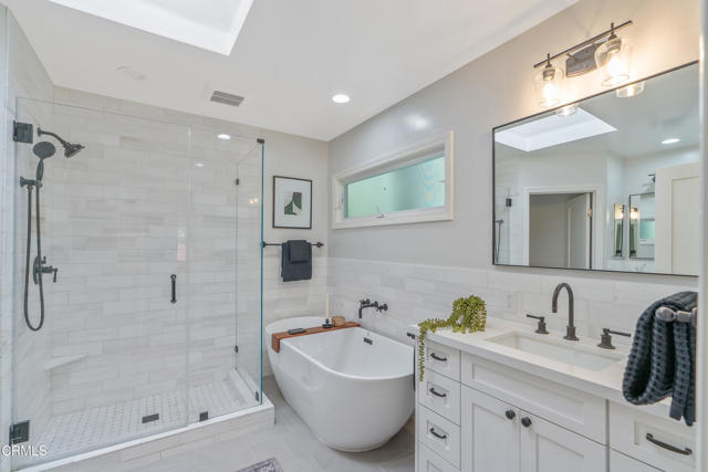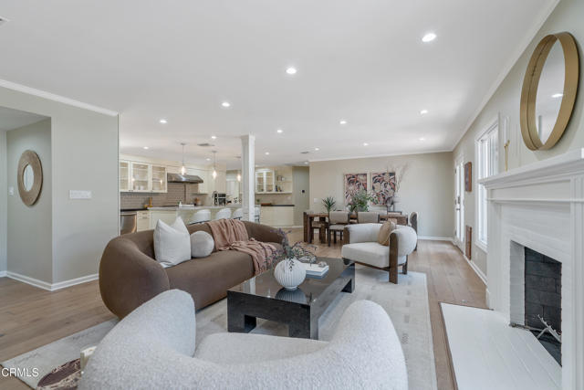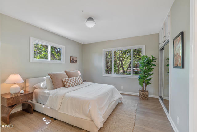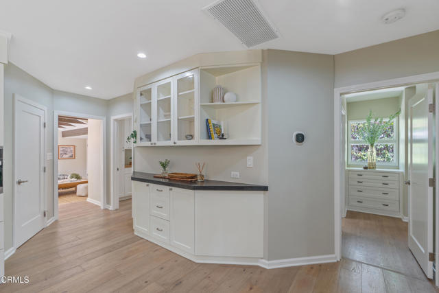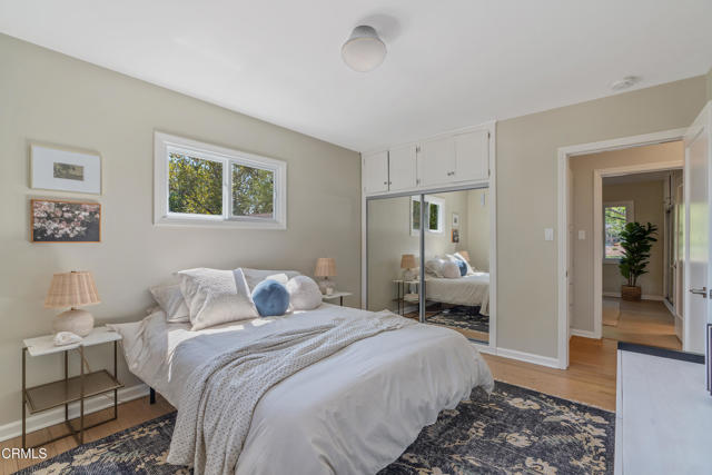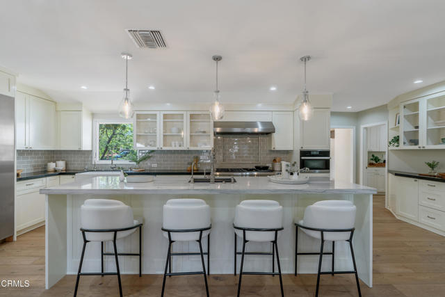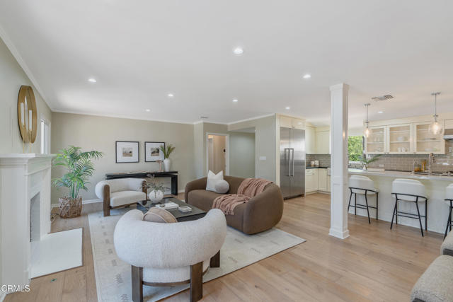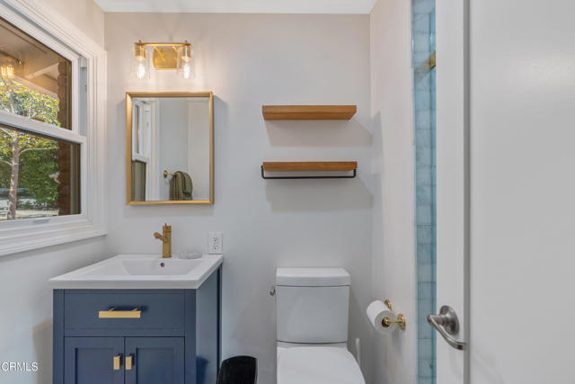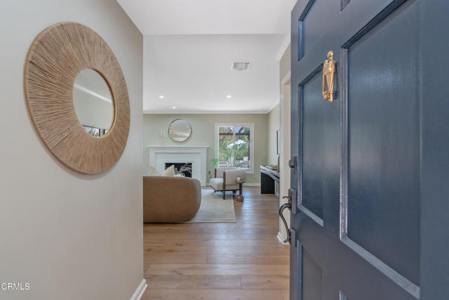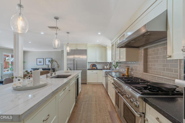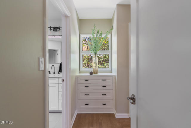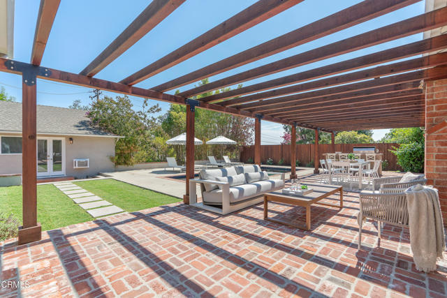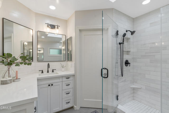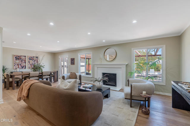 This updated Mid-Century Ranch feels completely tucked away on an idyllic, tree-lined street, despite its close proximity to charming downtown Sierra Madre. The home's layout is intuitive for a small crowd keen on entertaining. The open-concept great room shows off views of the serene yard with its sparkling pool, a brick fireplace, crown moulding, and recessed lighting. The bright, open-air kitchen is lined with custom solid wood cabinets, dovetail and soft-close drawers, a suite of Thermador appliances, a wine fridge, and a Miele steam oven. Just off the kitchen, you can keep everything organized in the walk-in pantry and the handsomely appointed laundry room. The south side of the home includes three spacious bedrooms, all filled with natural light, and two 3/4 baths. The north side of the home offers a bonus room with vaulted ceilings, a closet, a fireplace, and a half bath, which could easily function as a secondary suite. The primary suite boasts dual sinks, a freestanding tub, a truly incredible amount of closet space, vaulted ceilings, and glass French doors that lead out to the back patio. The primary suite and the great room open up to the expansive backyard, offering you that coveted indoor-outdoor flow that's as ideally suited for entertaining as it is for quiet contemplation. Spill out onto the pergola-covered brick patio with its built-in gas BBQ and mini fridge, take advantage of the flat lawn, play in the black bottom pool, and rinse off in the cabana's 3/4 bath. The split-level backyard offers even more space for you to get creative, perhaps with gardening beds, a playground, or both. The home has seen many updates, including remodeled baths and kitchen, new floors, doors, and windows, updated pool equipment, a whole home generator, a tankless water heater, and more. 180 S Mountain Trail shows off clear views of the San Gabriel mountains, with a setting that puts you just minutes away from local favorites like Syndicate, Emmi's, Lucky Baldwin's, Wistaria, and the Buc, as well as parks, the Mount Wilson Trail, the Arboretum, Santa Anita Park, and Westfield Santa Anita.