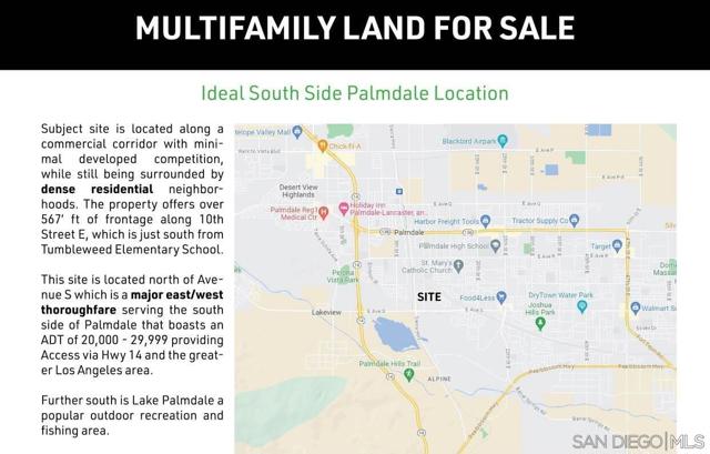 Prime Investment Opportunity in Palmdale, a thriving aerospace hub with a severe housing shortage and robust economic growth. No new apartment developments in over 30 years have created an extreme supply/demand imbalance, perfect for residential development. Key Highlights: High-Demand Market: Home to 20,000+ well-paid aerospace professionals from Northrop Grumman, Lockheed Martin, Boeing, General Atomics, and NASA at USAF Plant 42. Major Economic Drivers: Recent long-term defense contracts, including 80 Billion for B-21 bomber jets, Skunk Works AI and robotics programs, and Supersonic X-Plane development. Job Growth: Immediate technical and assembly jobs, with 2,500+ new positions driving 6,000+ support jobs in the local economy. Regional Commitment: Lockheed Martins new 208,000 SF advanced manufacturing facility (2022) underscores long-term investment in Palmdale. Capitalize on this rare opportunity to develop in a high-growth, underserved market with strong economic fundamentals. Perfect for residential or mixed-use projects.