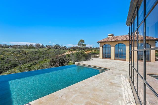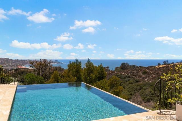 A serene setting of exceptional privacy and beauty awaits at this extraordinary North La Jolla estate, where sweeping views of the ocean, canyon, and La Jolla Cove create a priceless backdrop. Quality craftsmanship and a breathtaking design aesthetic define the luxe interior, which offers 3 en suite bedrooms plus an optional 4th, a climate-controlled wine cellar, sauna, and walls of windows showcasing the surrounding scenery. The light-filled foyer introduces soaring beamed ceilings with skylights, antique herringbone pavers, and double iron doors enhancing the inviting indoor-outdoor flow. Expansive entertaining spaces include a voluminous living room crowned by a barrel vault ceiling, a formal dining room overlooking lush greenery, a fully equipped chef’s kitchen with custom cabinetry, and a family room/library with cathedral ceiling, abundant bookshelves, and one of five fireplaces. Each bedroom boasts a spa-like bath, including the private primary retreat. A large flex space with its own bath and sauna could serve as a 4th bedroom. Outdoors, a sprawling stone patio with fireplace and infinity-edge pool invites effortless enjoyment of La Jolla’s year-round climate. Situated on a cul-de-sac in the Upper Shores with convenient access to beaches, UCSD, shops, and UTC. Available immediately, unfurnished, at $25,000 per month with a one-year lease.