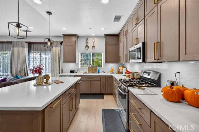 Beautifully updated 4-bedroom, 3-bathroom home located in a desirable community in Canyon Country. This spacious residence offers comfort, style, and functionality throughout. All four bedrooms are conveniently situated upstairs, including two full bathrooms, while a powder room is located on the main floor for guests. The home features a fully remodeled kitchen with modern finishes, new flooring, and custom built-ins that add both charm and practicality. Enjoy a bright and open living area that flows seamlessly into the dining space and kitchen — perfect for entertaining. Step outside to a nicely sized backyard, ideal for relaxing or hosting gatherings. This gated community offers resort-style amenities including a community center, park, tennis courts, and sports courts for residents to enjoy. The home is also equipped with solar panels, providing significant savings on electricity costs. Conveniently located near shopping, dining, and top-rated schools, this move-in-ready home perfectly blends modern living with community comfort.