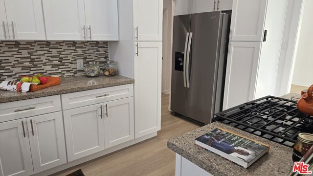 Located in Leimert Park, this Mediterranean inspired upper 2-bdrm and two bath duplex has been completely renovated. It includes a spacious living room with arched ceiling, fireplace and picturesque view of the neighborhood. The formal dining room can accommodate several guests and is a great space for dinner gatherings. The newly remodeled kitchen has stainless steel refrigerator, gas stove and vented hood, white shaker cabinets with soft closing doors and drawers, and imported solid surface granite countertops. The eat-in breakfast room with its built-in cabinet can be converted to an in-home office. The separate laundry room has an LG front load full-size washer & dryer. The primary bedroom is huge and has two walk-in closets plus an en suite bathroom. The 2nd bedroom is a generous size. The second bath is stunning and has a tub with separate shower. New vinyl windows. New wide plank wood floors throughout. New mini blinds. Interior freshly painted. New copper plumbing. New electrical. Detached garage for single car. Private front courtyard with enchanting garden--where butterflies abound. Owners reside downstairs. No pets or smoking. Close to Metro rail and bus lines. Restaurants, retail shopping nearby. Available for occupancy Nov 1.