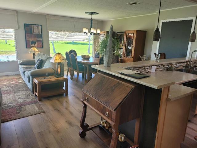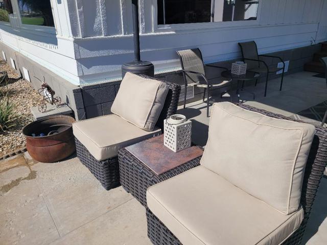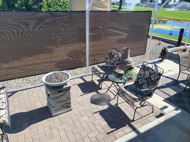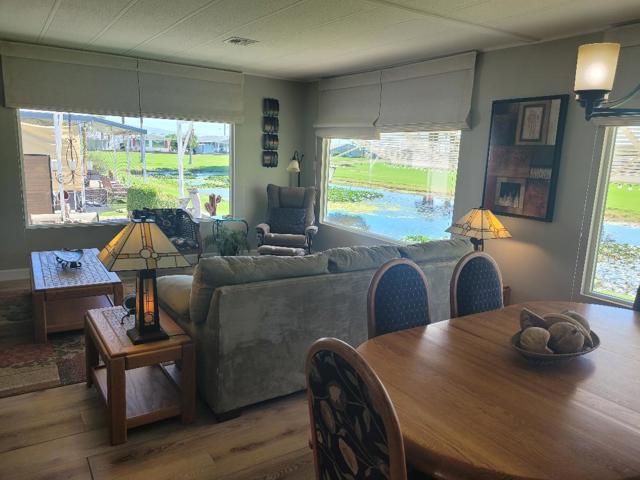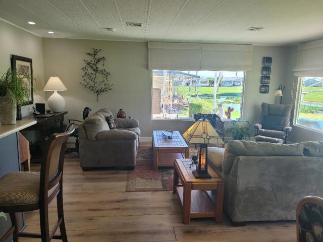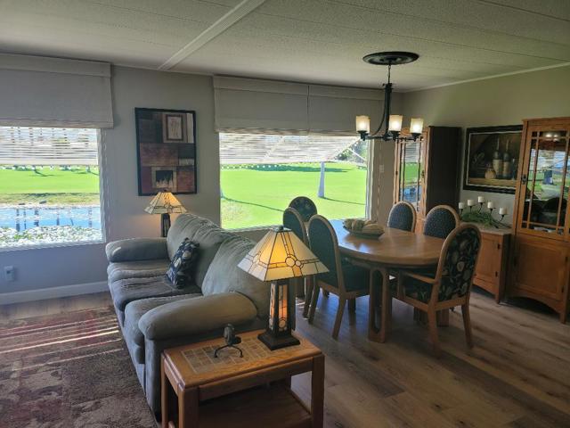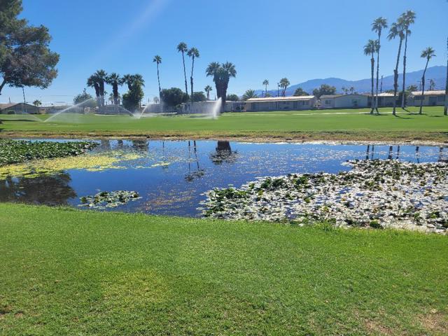 55+ Spectacular Home on Golf course! Absolutely gorgeous!! This is a rare gem of a home with high quality designer decor and is beautifully remodeled. Home has a delightful open floor plan that looks out through new giant picture windows at the beauty of lush green grass, mountains and a pond complete with lilies. The kitchen has a long peninsula counter that flatters the entire room and enables you to chat with friends and family while cooking. There is drywall and outstanding vinyl laminate throughout plus upgraded bathrooms. Everywhere you look there is thoughtfulness and good taste put into the design. There is also a third bedroom suite that offers perfect privacy to guests.The home sits on a larger lot and outside there are three areas for lounging and enjoyment plus two fire pits. The beautiful patio furniture stays with the house and there is plenty of seating to sit and enjoy the outstanding mountain sunset. House comes turnkey furnished. One low monthly homeowners fee includes unlimited use of two golf courses for two owners plus the two sparkling pools, spas and restaurant. Tri Palms Estates and Country Club is situated in the ideal Valley location because it is close to all conveniences including, Costco, Sams, Home Depot, Casinos, and hundreds of restaurants. The Acrisure Arene is only minutes away and the Valley features top entertainers all year long.