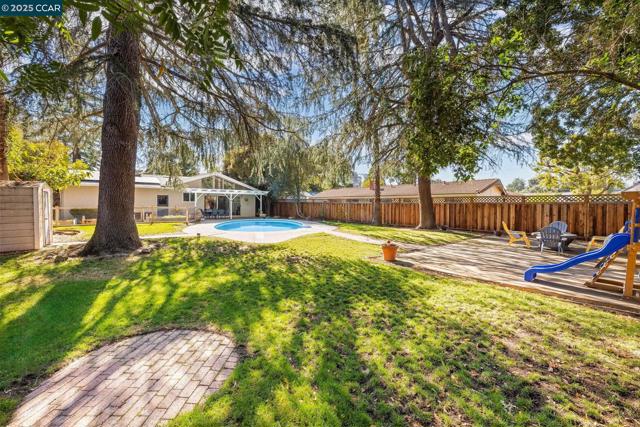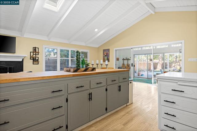 Single-story retreat set on a secluded .3-acre lot in Walnut Creekâs Carriage Square neighborhood. Inside, vaulted beamed ceilings and abundant natural light create an airy, open-concept living space connecting the living room, dining area, and kitchen. The updated kitchen features quartz countertops, subway tile backsplash, stainless-steel appliances, and an expansive island perfect for entertaining. A fireplace anchors the living area, framed by plantation shutters and skylights that fill the space with soft daylight. The adjoining sunroom offers a flexible bonus area, ideal for a home office, gym, or playroom, with direct access to the backyard. The primary suite provides a tranquil retreat with private patio access and a remodeled ensuite showcasing modern finishes. Two additional bedrooms share a hall bath with a double-sink vanity. Outdoors, the private backyard invites relaxation and recreation with a covered patio for alfresco dining, a sparkling pool for summer gatherings, a garden area for homegrown produce, and a play zone shaded by mature trees. Near Bancroft Elementary and just minutes from De La Salle and Carondelet High Schools, this home offers excellent access to shopping, dining, BART, and major commuter routes.