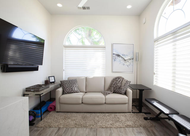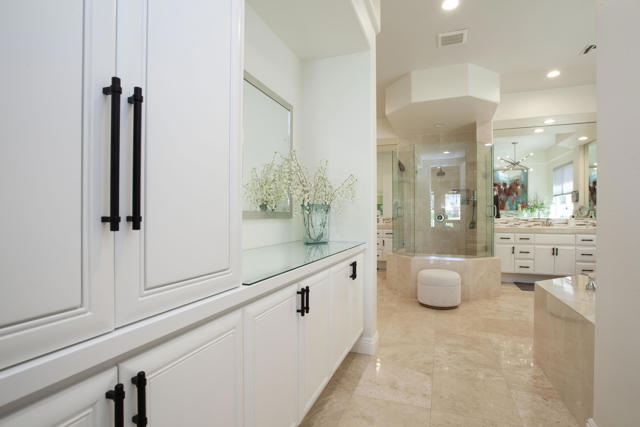 Step into refined desert sophistication at this stunningly remodeled contemporary retreat in the prestigious Rancho La Quinta Country Club. Every element of this residence has been masterfully curated to embody modern elegance, comfort, and tranquility. With no other home in the community offering such extraordinary fairway and mountain views, the setting feels like living inside a constantly changing work of art. From the moment you arrive, the lush landscaping, architectural precision, and commanding curb appeal set the tone for something truly special. Situated on an expansive 14,375 sq. ft. end lot with no neighbor on one side, this home is designed for ultimate privacy and serenity. The outdoor living spaces are nothing short of resort caliber. An entertainer's dream featuring a dramatic custom patio, sparkling pool and spa with cascading waterfall, fire pit, and sweeping vistas of the south and west mountains glowing at sunset. A two-room detached guest casita provides comfort and autonomy for guests, blending seamlessly into the design yet offering its own quiet retreat. The main home invites you through a striking custom front door crafted of hot-waxed glass and rich wood, revealing a light-filled great room that perfectly balances openness with warmth. Walls of windows frame the spectacular views, while a thoughtfully reimagined floor plan achieved by removing a dividing wall unites the kitchen, dining, and living areas in perfect harmony. Dual modern fireplace walls create dramatic focal points, complementing soaring ceilings and sleek architectural lines.The chef's kitchen is a showpiece in itself, anchored by a massive quartz-topped island ideal for entertaining. Outfitted with premium stainless-steel appliances, Cambria stone surfaces, refreshed millwork, and a climate-controlled wine cellar, it's designed for both daily indulgence and gourmet artistry. Control 4 home automation seamlessly integrates lighting, climate, and sound throughout the home, offering luxury at your fingertips. Every detail reflects quality: travertine floors, refined base molding, custom window treatments, and designer lighting that sets a warm, ambient glow. Even the practical spaces shine. The expanded four-car garage features epoxy flooring, dedicated air conditioning, and a custom wood-look door. A paver driveway and meandering walkways tie the exterior together with effortless elegance. Offered partially furnished. Please see Improvements and Amenities list.