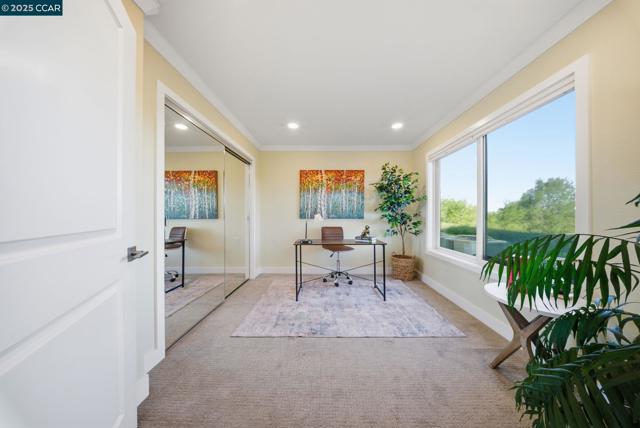 Experience breathtaking views and luxury living in this stunning reimagined Golden Gate RARE 2BD/2BA Level-In end unit! Completely remodeled from top to bottom approx 5 yrs ago, this home boasts a million-dollar view of Mount Diablo from an expanded, custom-tiled front patio—perfect for soaking in the scenery and savoring the tranquil eastern facing setting. Step inside the chef’s kitchen equipped with stainless steel appliances, custom tilework, quartz countertops, solid wood cabinets w/soft-close drawers and striking pendant lighting. Two full bathrooms evoke a spa-like retreat with exquisite designer tile finishes and a full-size W&D. Upscale touches like beautiful vinyl plank flooring, crown molding, dual-pane windows, recessed LED lighting add elegance throughout. Additional features include a carport with custom extra storage, newer A/C unit installed via the Mutual, designer light fixtures, and contemporary front door. Enjoy seamless indoor-outdoor living with gorgeous views out every window, inviting abundant morning and afternoon Natural light. Additional private outdoor space perfectly appointed off the dining oom and kitchen. Rossmoor is the Premium 55+ Community w/a plethora of activities including, Golf, Tennis, PickleBall, State of the Art Gym and so much more!