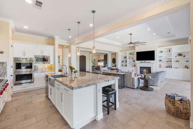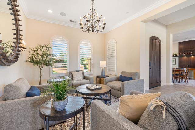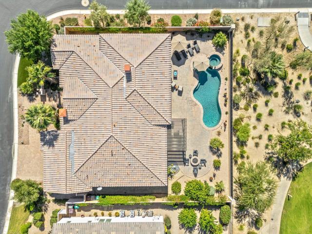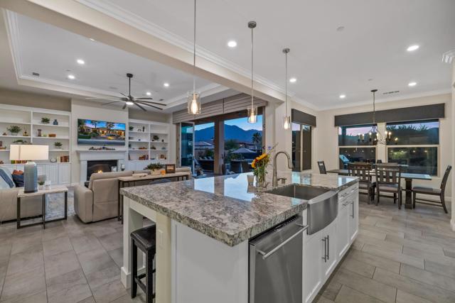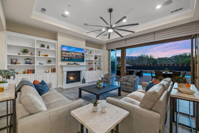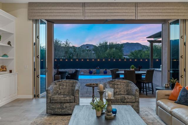 Perfectly positioned on a private corner lot within the coveted gated enclave of Griffin Ranch, this 3-bedroom, 3.5-bath residence embodies refined desert elegance. Designed for effortless indoor-outdoor living, this home features an open-concept floor plan, high-end finishes, and sophisticated architectural details throughout.The expansive great room flows seamlessly to a covered loggia overlooking a sun-drenched pool and spa--an inviting setting for relaxation or entertaining. A newly built BBQ pavilion beneath its own pergola sits conveniently near the kitchen, creating a natural hub for gatherings. As day turns to dusk, evenings around the firepit are illuminated by unforgettable sunset views of the Santa Rosa Mountains.An expanse of lush greenbelt behind the property ensures the mountain vistas remain uninterrupted by nearby rooftops, adding to the sense of privacy and openness. Inside, the welcoming foyer introduces a stylish conversation lounge or office on one side and a casual bar area with game table on the other side. The smart, split-bedroom design offers exceptional livability, with the serene primary retreat privately situated at one end of the home and two guest suites at the other. Additional highlights include custom tile flooring throughout the main living spaces and a three-car garage.Griffin Ranch residents enjoy an incomparable lifestyle, with resort-style amenities that include a clubhouse, state-of-the-art fitness center, tennis and pickleball courts, Jr. Olympic size resort pool, bocce ball courts, event space, etc! --all set against the dramatic backdrop of the Santa Rosa Mountains.