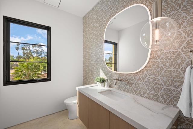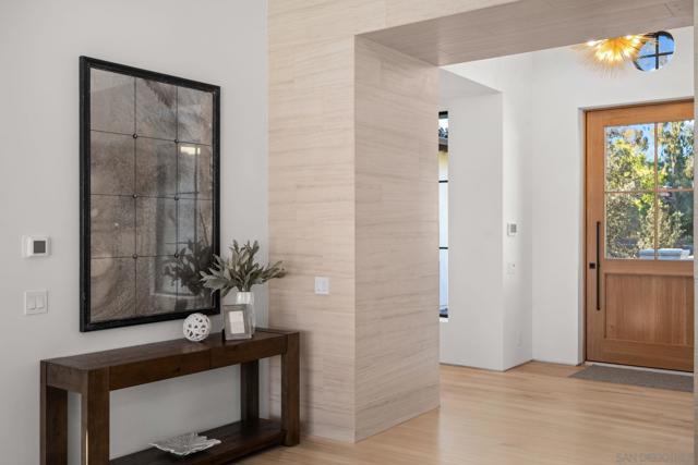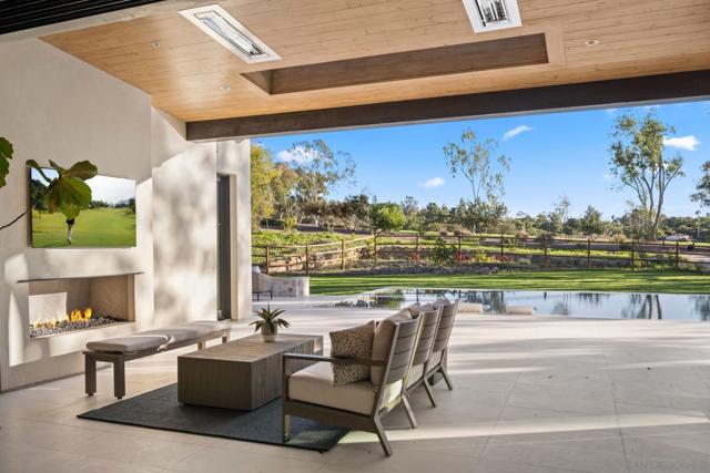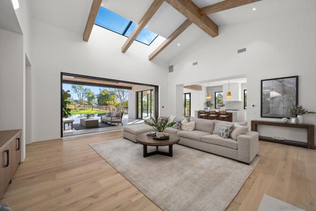 Brand-new construction 2025 on the picturesque Rancho Santa Fe Covenant Golf Course. Built by Greg Agee, this estate embodies the spirit of Rancho Santa Fe resort living on one of the Covenant’s most desirable streets. Set on beautiful and usable lot with wide fairway views and total privacy, it features European white oak floors, steel windows with warm wood interiors, and abundant natural light creating a calm, refined atmosphere with Sonos surround sound combining the sophistication of a five-star retreat with the warmth of home. Fireside great room designed with dramatic wood beams opens through expansive sliding doors to an outdoor living area with skylights and a stone fireplace, blending seamlessly with the zero-edge saltwater pool/spa, outdoor firepit and lush turf area designed for lounging and play overlooking the golf course. The gourmet kitchen is a showpiece with SubZero and Wolf appliances, custom stone detailing, an oversized island, double-oven and a prep kitchen with additional storage and dishwasher. The spacious primary suite offers a tranquil retreat with a spa shower under a skylight, infrared sauna, and hand-finished walnut cabinetry offering the ultimate in comfort. Additional amenities include a 4K home movie theater, game room with wet bar, private gym, owned solar, Race fiber internet, 4-car garage, and private motor gated entry. A rare new-construction opportunity in the Rancho Santa Fe School District: modern, private, and timeless with easy access to village, schools, golf and shopping.