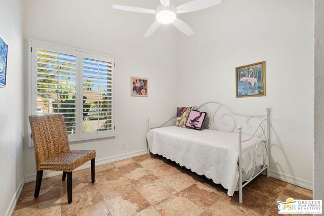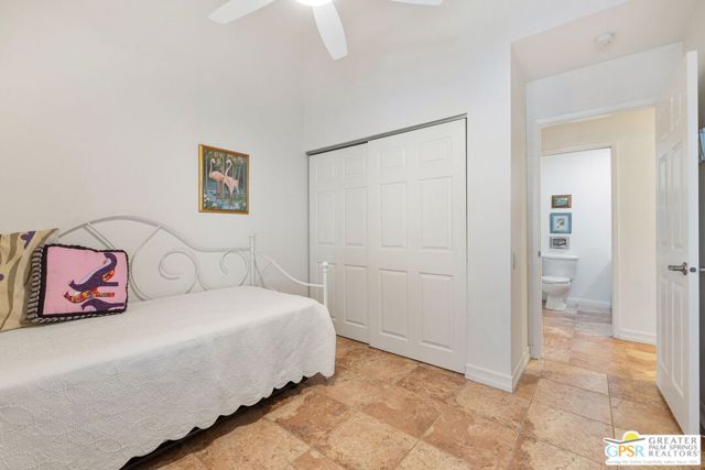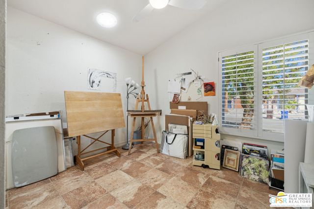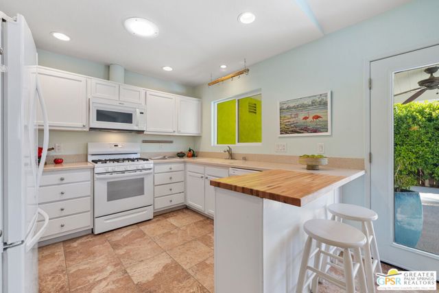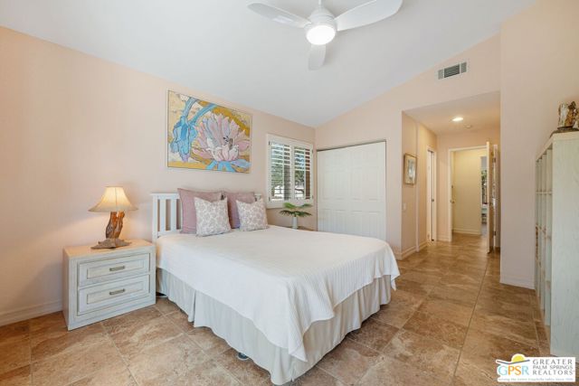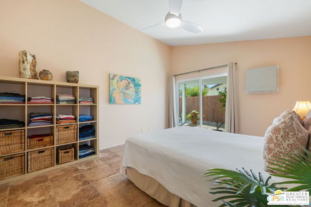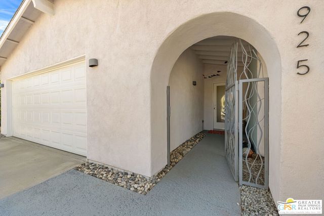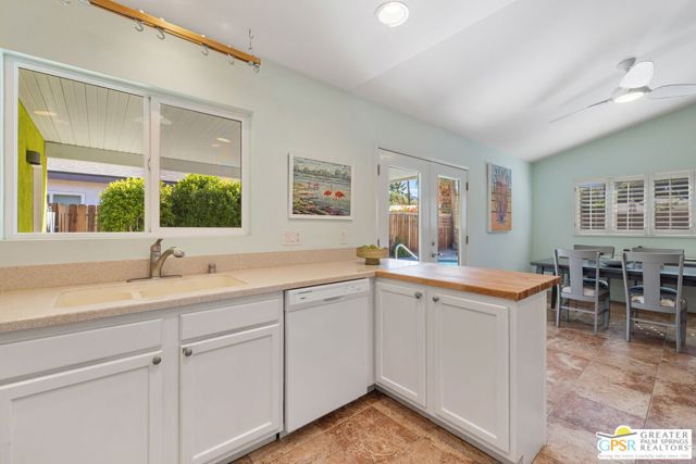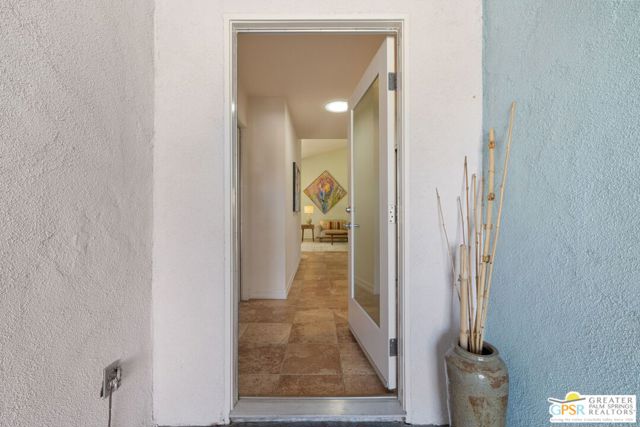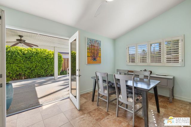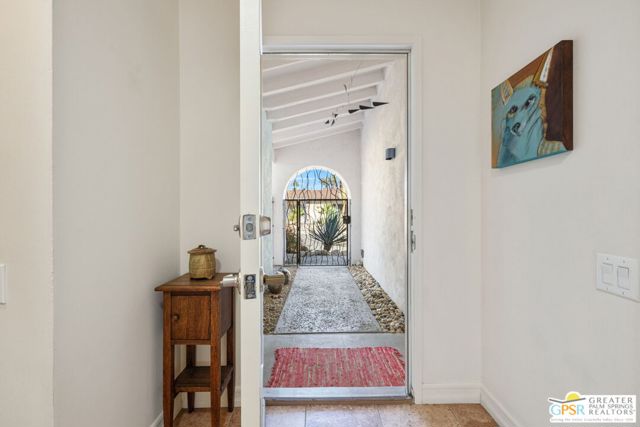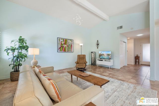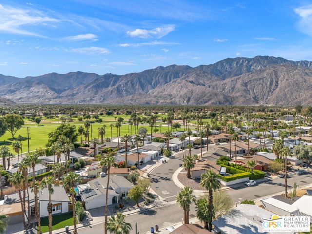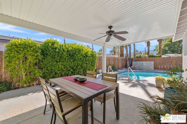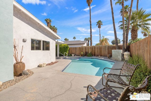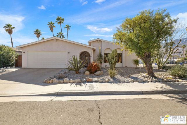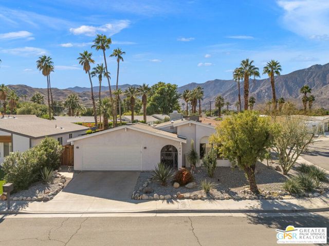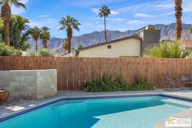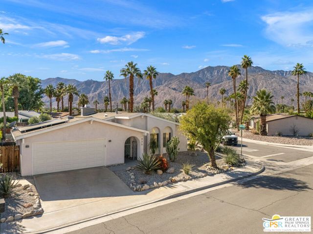 The ONE TO SEE! A wonderful sense of place in South Palm Springs. This easygoing and sun filled 3 bedroom 2 bath home on Fee Land sits proudly on a corner lot near Demuth Park and captures the spirit of Palm Springs living. Tall vaulted and beamed ceilings create an airy feel, while tile flooring and natural light add warmth throughout. The open concept living and dining areas connect to a cheerful kitchen with solar tube overhead that brings in beautiful natural light. Outdoors, mountain views frame a sparkling pool and spa, two covered patios, and desert wise landscaping accented by a gated entry and great curb appeal. The primary suite, set under a vaulted ceiling, opens to its own covered patio and pool area, while both bathrooms feature updated countertops and mirrors. Guest bedrooms two and three share a bath along the central hall and more solar tubes work their magic. Two car garage with laundry area, OWNED SOLAR for energy savings, and updated HVAC in recent years. This home is also currently eligible for a Short Term Rental permit from the city. Take the Matterport Virtual Tour for a better sense of flow. Close to Prescott Preserve, CV Link, and downtown Palm Springs fun.