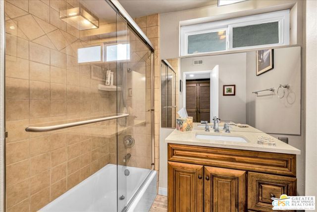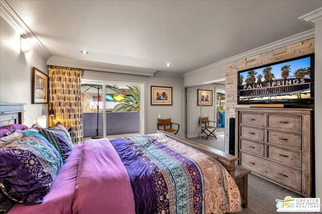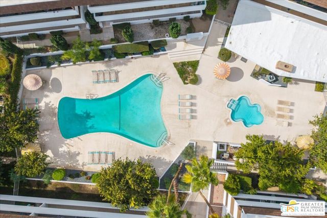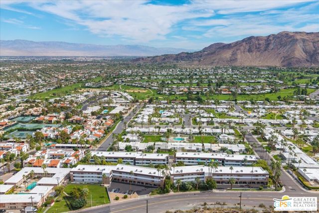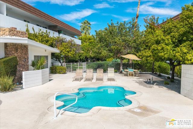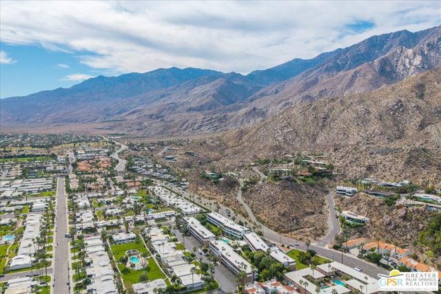 Welcome to Canyon View Condos, an iconic mid-century modern community designed by noted architects Wexler and Harrison and developed by Robert Fey. This highly sought-after enclave is celebrated for its timeless design, low-density setting, and ideal South Palm Springs location nestled between the mountains and one of the city's most prestigious neighborhoods. Surrounded by dramatic mountain views and close to world-class hiking, golf, and downtown Palm Springs, this is desert living at its finest. This beautifully upgraded 2 bedroom, 2 bathroom condo offers approximately 1,163 square feet of light-filled interior space with classic mid-century lines and modern finishes. The open floor plan features large windows and sliding glass doors that fill the home with natural light while capturing stunning views of the surrounding landscape. The upgraded kitchen showcases quartz countertops, mosaic tile backsplash, stainless steel appliances, and sleek cabinetry that flows seamlessly into the dining area, perfect for entertaining while enjoying the views. The spacious living room features carpet flooring, recessed lighting, and dual sliders that open to an expansive east-facing patio overlooking lush green space and the sparkling pool. The primary suite also offers soft carpet underfoot, a slider to the patio, generous closet space, and a designer stone accent wall that adds texture and style. Tile flooring extends through the entry, kitchen, hallway, bathrooms, and guest bedroom, creating a clean, cohesive look throughout. The primary bath features a large walk-in shower with modern finishes. The guest bedroom is equally inviting with a statement stone feature wall and tongue-and-groove shiplap wood ceiling accented by recessed lighting. The guest bath offers a stylish shower and tub combination with updated fixtures. The private patio enjoys morning sun and afternoon shade, perfectly oriented to enjoy east-facing views while being protected from the harsh summer heat, helping reduce utility costs. The setting is tranquil, with the pool and greenbelt just steps away, creating an ideal indoor-outdoor living experience. Community amenities include a large swimming pool and spa, clubhouse, and on-site laundry facilities. Owners also have the option to install in-unit washer and dryer systems with HOA approval. The low monthly HOA fee covers Wi-Fi, cable TV, gas, water, sewer, and community amenities, providing exceptional value and convenience. Canyon View Condos remains one of Palm Springs' most recognizable and desirable mid-century communities, celebrated for its architectural significance, serene setting, and proximity to everything the desert lifestyle offers. Whether as a primary residence, weekend retreat, or investment opportunity, this home captures the essence of Palm Springs modern living.