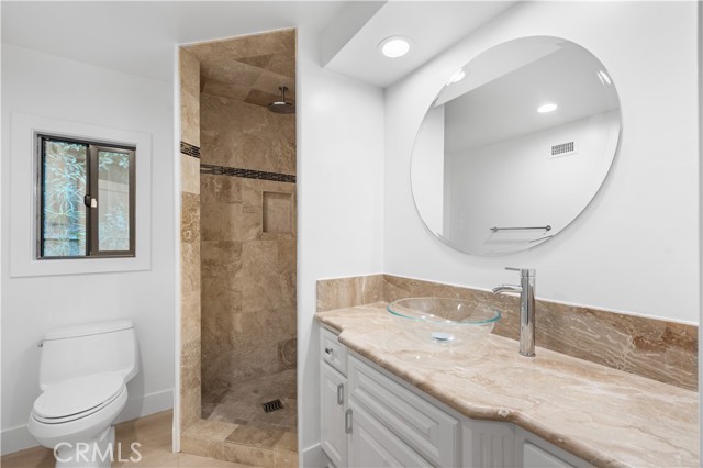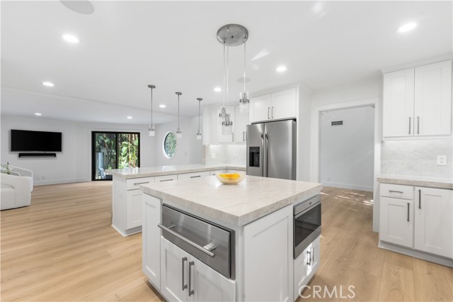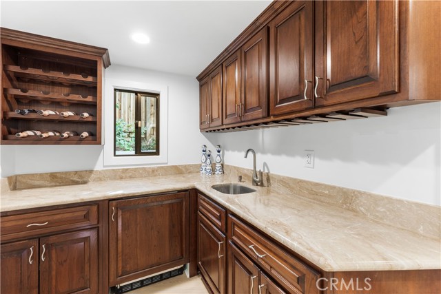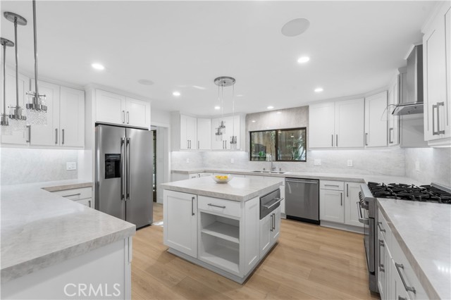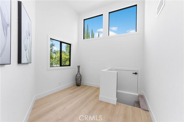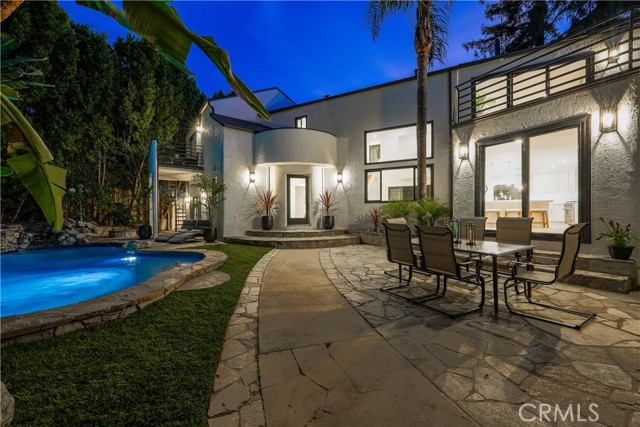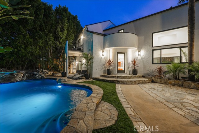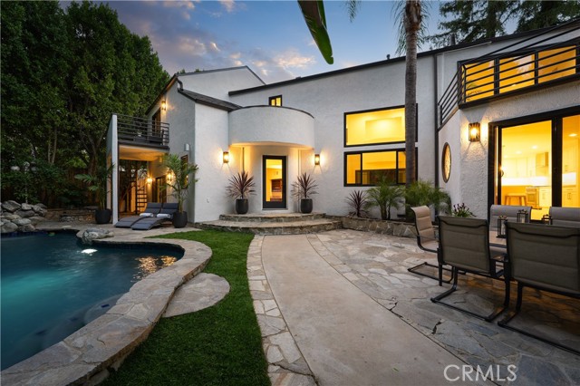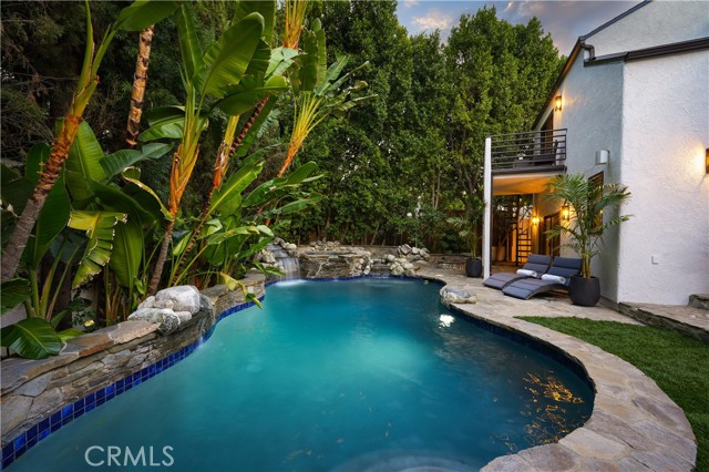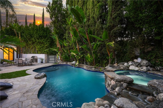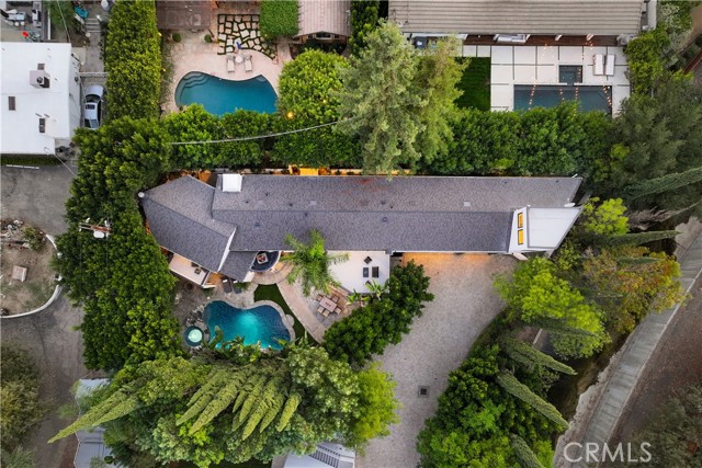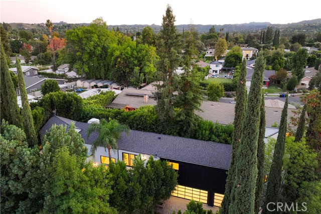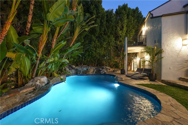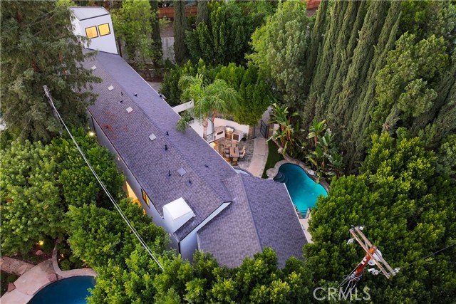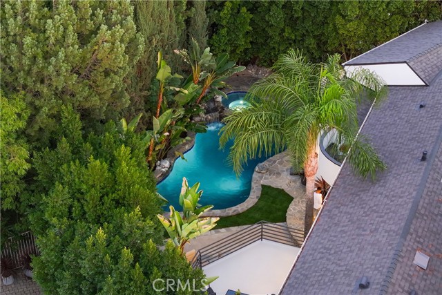 Welcome to a one-of-a-kind gated Custom home located in the very desirable Walnut Acres neighborhood of Woodland Hills. Designed by acclaimed Los Angeles architect Mark Bielski and built in 1987 on a .38 acre lot, this unique home spans 3,929 square feet, offering 4 bedrooms, 5 bathrooms, a sunken living room with a fireplace, a bar and an office area overlooking the pool. The dining room, which overlooks the serene tropical pool, has a vaulted ceiling with large windows that bring in plentiful light and a french door which opens to a relaxing outside seating area. The large kitchen has gorgeous new quartz counter tops, a new refrigerator and dishwasher, a Thor gas stove and a Wolf microwave and warming drawer. The adjacent family room has a sliding door leading to the BBQ area and the pool. A beautiful waterfall accentuates the tropical feel of the pool and spa, which are surrounded by tropical plants creating a very relaxing atmosphere. Upstairs, the large primary bedroom has a vaulted ceiling, a balcony with a spiral staircase leading to the pool area, a large walk in closet and a spa like bathroom. Down the long hallway is a secondary bedroom with an en suite bathroom and a large balcony overlooking the pool. Further down the hallway are another bathroom, a bedroom and a movie theater which comfortably seats 11. Finally, the fourth bedroom is located in "the tower,” with a loft and with stairs leading down to the living area which includes a kitchenette and a bathroom. The tower has its own entrance, offering the potential for a separate rental unit. The long driveway can accommodate many cars and leads to a 3-car garage, which includes a Tesla charger. Some of the recent updates of this home include a new roof, freshly painted interior and exterior, new windows, doors, flooring, kitchen counter, light fixtures, hardware, garage door openers and landscaping. This home is conveniently located to shopping and dining of the Topanga Village and Calabasas Commons, as well as the upcoming Rams Village and the 101 freeway. Falls within a well-regarded school district. Come see this hidden gem before it's gone!