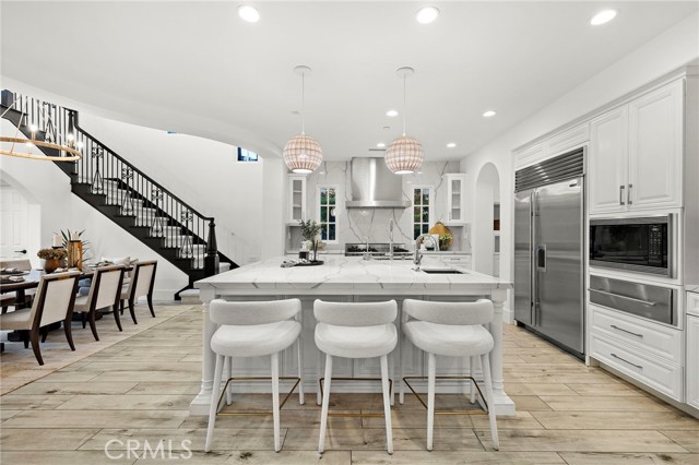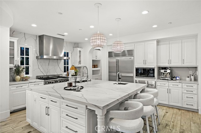 Experience refined coastal luxury in this beautifully reimagined residence located within the prestigious guard-gated community of Pacific Ridge in Newport Coast. Thoughtfully redesigned from top to bottom, this home blends timeless architecture with modern sophistication—highlighted by breathtaking ocean, Catalina Island, canyon, and city-light views from multiple indoor and outdoor living spaces. A gated loggia entry welcomes you into an elegant and functional layout featuring a highly desirable main-level ensuite bedroom with a private entrance, ideal for multigenerational living, long-term guests, an office suite, or an au-pair. Inside, the home showcases premium wood-look tile flooring, custom designer lighting, and an open-concept great room with wood-beamed ceilings, a cozy fireplace, and seamless flow through French doors to the tranquil backyard. The chef’s kitchen is outfitted with Wolf 6-burner range + BBQ, Sub-Zero refrigeration, Miele cappuccino station, convection oven, quartz counters, and an expansive Calacatta marble center island—a perfect blend of beauty and function. Upstairs, the oversized primary suite captures panoramic ocean & Catalina views, complete with a private balcony, luxurious freestanding soaking tub, walk-in closet, makeup vanity, and soaring ceilings. Two additional guest bedrooms, a spacious laundry room, and a quiet office/library nook complete the upper level. The wraparound backyard borders a peaceful canyon and is thoughtfully designed for entertaining with a covered loggia, Lynx outdoor kitchen, refrigerator, bar counter, built-in fire pit, and a saltwater spa/pool with a soothing waterfall feature. The sellers also recently upgraded the pool equipment for enhanced efficiency and ease of use. Additional features include: updated landscaping, designer finishes throughout, a 3-car attached garage, and exceptional privacy. Residents of Pacific Ridge enjoy exclusive access to a heated Jr. Olympic pool, spa, clubhouse, parks, playgrounds, BBQ areas, and scenic hiking/biking trails—with direct pathways leading toward Crystal Cove State Beach. A rare turnkey coastal retreat offering ocean views, privacy, and elegant indoor-outdoor living within one of Newport Coast’s most coveted gated communities.