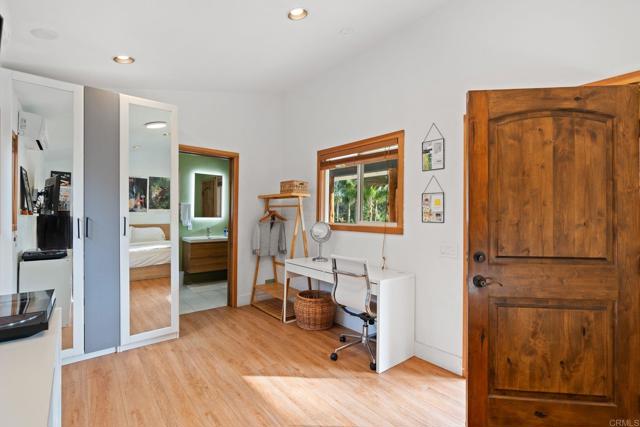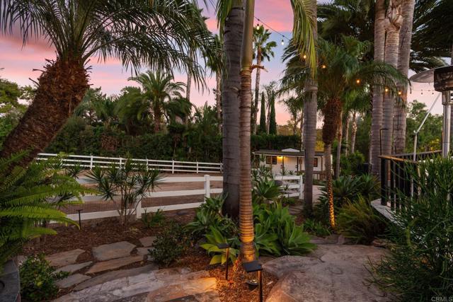 Charming, private Olivenhain home situated at the end of a small road with direct access to the bridle trail. Very private .83 acre lot with big views of the Olivenhain valley. This gated property is very versatile and features 2 bedrooms, 2 baths and a large office in the home, as well as a separate guest house with 1 bedroom and bath. In addition there is another separate detached office, an attached 2 car garage (which is currently set up as an art studio), 2 covered stalls that are open and can be used as a carport, a separate storage building and another building that would make a perfect shop or studio. The square footage, as per Assessor's office, is for the home only. The property was set up for horses by the previous owner with covered stalls, sand arena, corral, tack shed, hay storage, wash rack, etc., and could be utilized again by new owner. Gorgeous pool and spa overlooking the beautiful, serene country views. Great outdoor BBQ area adjacent to the pool with lots of decking and a firepit. Part of the arena is set up as an spacious entertaining/party zone. Amazing grounds also include an orchard with tropical fruits, citrus and stone fruit, raised garden beds and a large chicken coop and a fenced corral for animals. Direct access to miles of walking and riding trails from this home. This is a very unique and special property in the heart of Olivenhain. Owned solar electric and A/C in all living areas. OPE Elementary. No HOA or Mello-Roos.