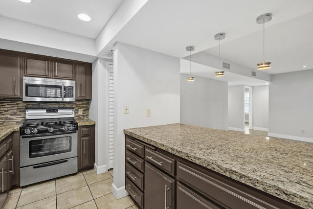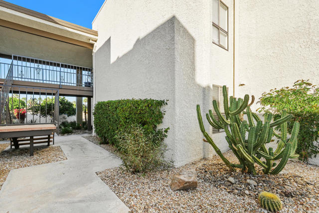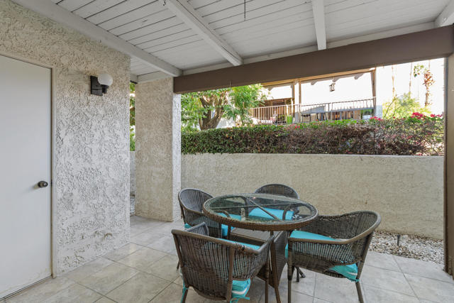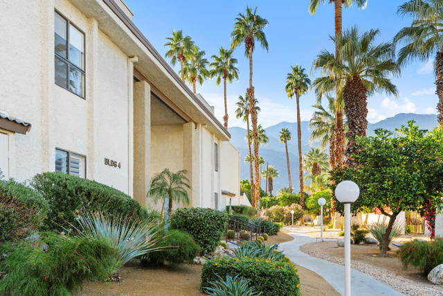 Discover resort-style living in this STUNNING corner-unit condo perfectly situated in desirable SOUTH PALM SPRINGS. This single-level, first-floor residence offers an inviting open layout with fresh paint, plantation shutters, and designer upgrades throughout. The sleek kitchen is appointed with stainless steel appliances, granite counters, and a breakfast bar, while the spacious primary suite enjoys separation from the guest rooms for ideal privacy.Step outside to your large, fenced patio, located just steps from the sparkling community pool. The gated community features lush grounds, 2 pools, spas, and tennis courts, providing the ultimate Palm Springs lifestyle.Additional features include covered assigned parking, abundant guest parking, and convenient EV charging stations. Fee simple land adds exceptional long-term value.