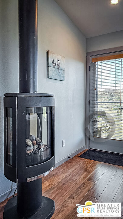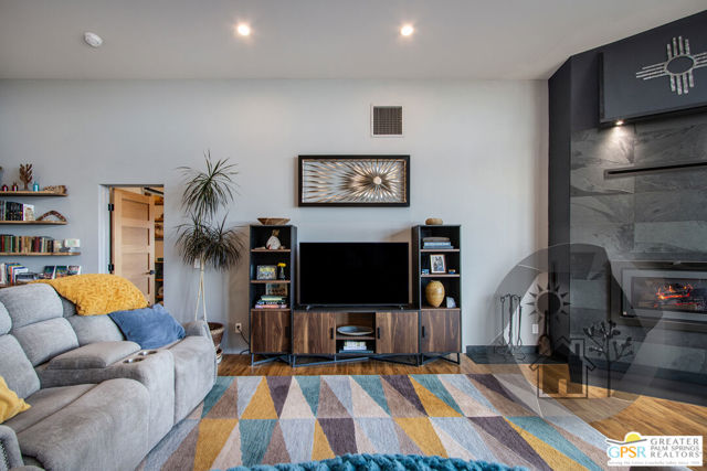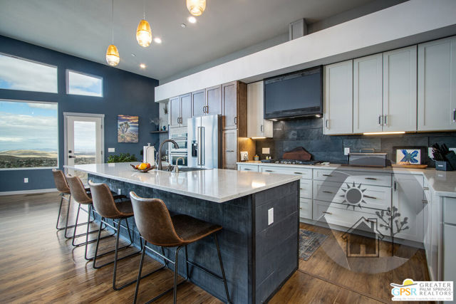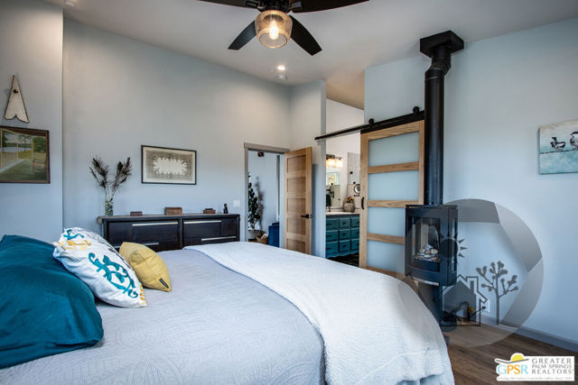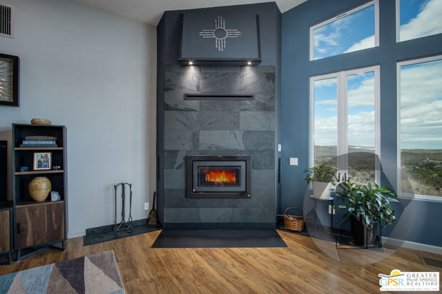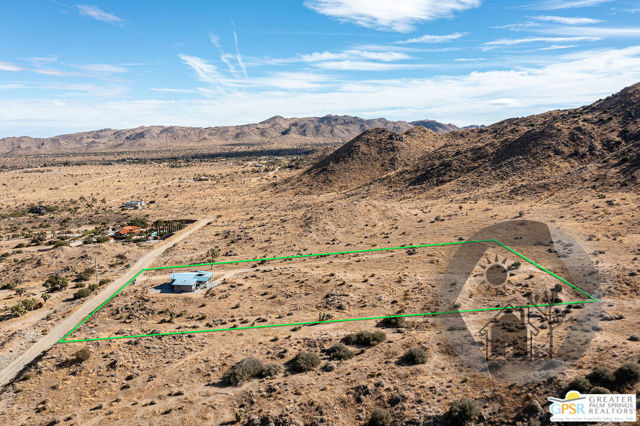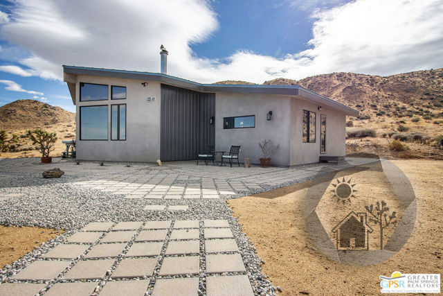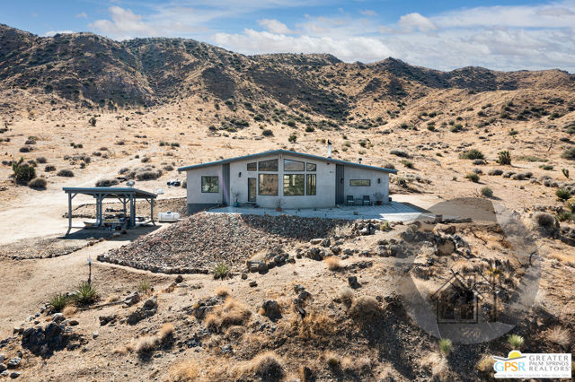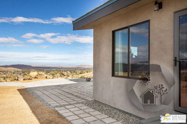 A Truly Exceptional property with Spectacular views overlooking Yucca Valley and beyond! This Custom home was lovingly designed and built in 2021 with the unparalleled views in mind! Nestled in the south side hills of Yucca Valley at an elevation of about 3800 feet, this home offers the best of what the rural desert experience has to offer while still being just 3.5 miles from the center of town with all it's great restaurants and quaint shops! Whether you are looking for a full-time residence with land that provides you privacy, peace and quiet, or as a vacation home to get away from it all, this is the gem you've been dreaming of! The Joshua Tree Natl Park hills are even located very close to the back of this 5 Acres, so for nature lovers, this is the place for you to enjoy sightings of Gambel's Quail, Roadrunners, and other species of birds plus the Cottontails and Jackrabbits and an occasional Coyote, Mule Deer and other beautiful animals! This modern layout also includes a partial basement with almost another 400 SF now used for storage and workshop but would be great Guest Quarters! The Front door is facing the private South hills with 18x22 Gorgeous patio entry to this beauty! The outdoor areas on 3 sides with custom doors provide views and relaxation areas. The home features Stone, Glass, Metal and Stucco exterior and the Great Room is breathtaking as you enter! You can see forever in the expansive almost floor to ceiling windows! Custom light fixtures are amazing, vaulted beamed great room and the kitchen is so special! Gorgeous custom cabinets, huge quartz island and breakfast bar and large dining area by those windows! Built in Coffee/Wine bar and also great reading nook. Custom live edge wood shelves in several areas. The home has two wings, each with a bedroom and bath. Master retreat is stunning with gorgeous view windows, it's own gas stove for cozy nights, and large gorgeous custom master bath with large walk in closet, large marble walk in shower and lovely vanity area. The guest room is great and bath is custom marble as well. Large laundry and pantry room with loads of cabinets. Upgraded appliances all stay too, Stainless steel. Has RO water and an instant hot water at the kitchen sink. This kitchen is a dream, with Wall oven and microwave, large gas range top and huge island with gorgeous cabinets. Once you get in this home, you honestly won't want to leave! You will feel like you are on top of the world! Custom fireplace in the living room has insert to heat over 2000 SF house. This home also has an owned solar system as well! Pictures don't do it full justice - Come see it for yourself! Truly one of a kind! Located only 2 hours from LA or San Diego with easy commute. Easy access but you feel like you are in complete privacy.