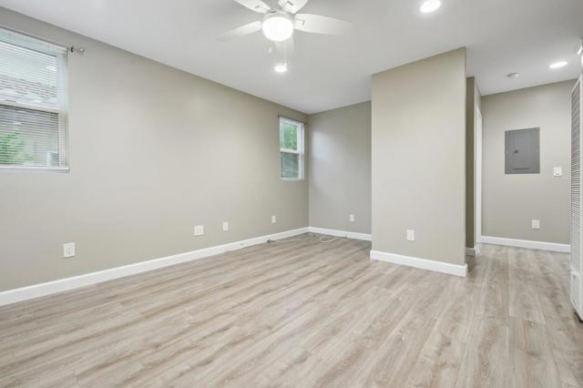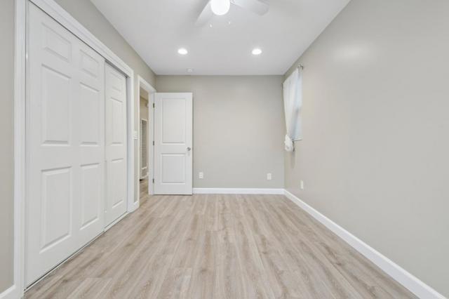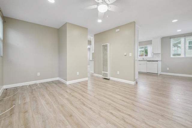 Offering a clean layout and neutral finishes, this two-bedroom, one-bath unit is designed for practical daily use and supported by central A/C for year-round climate control. Light-toned flooring runs throughout, creating a cohesive flow between shared and private spaces without overstating design details. The main living and dining area connects directly to the kitchen, allowing for easy transitions throughout the day. In the kitchen, white cabinetry, a full-size gas range, a dishwasher, and a tiled backsplash create a practical workspace, while multiple windows bring in steady natural light. The adjacent dining area offers flexibility for daily meals or a simple home setup. Both bedrooms feature matching flooring, recessed lighting, and ceiling fans, giving each room a balanced and usable feel. The bathroom includes a walk-in shower with tiled surround, a vanity with cabinet storage, and straightforward fixtures arranged to make good use of the space. Grocery options like Vons, Ralphs, and Trader Joes are close by, along with local cafes and eateries throughout the 6th Street corridor. Outdoor time is easy to plan with Point Fermin Park, the San Pedro Waterfront, and Cabrillo Beach all within a short drive.