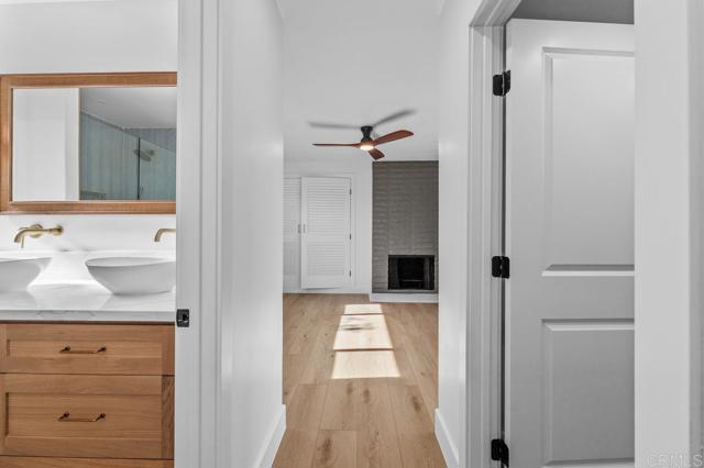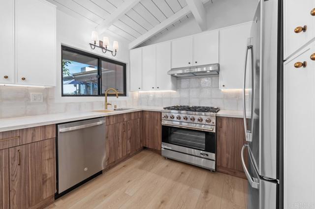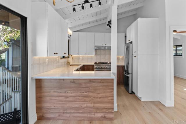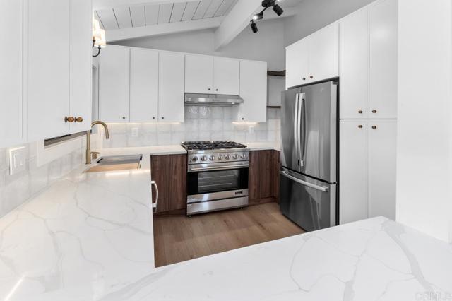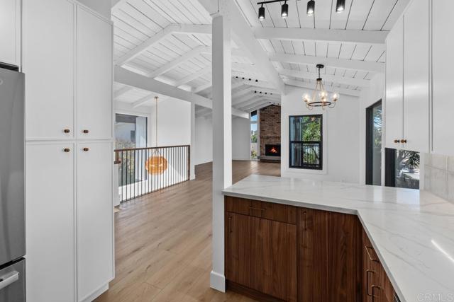Commanding breathtaking La Costa resort and golf course views, this exquisitely remodeled twinhome is privately positioned at the end of a quiet cul-de-sac. Designed for refined coastal living, the home blends architectural character with modern luxury, throughout. The expansive family room is highlighted by vaulted wood ceilings, a statement fireplace, custom wood shutters, and walls of glass that open to a Trex deck framing sweeping panoramic views. The dining room enjoys equally dramatic vistas, creating an elegant setting for everyday living and entertaining. The designer kitchen features quartz countertops, stainless steel appliances, and thoughtfully selected finishes that balance function and sophistication. Wide-plank luxury vinyl flooring flows seamlessly throughout the home. The residence offers three private bedroom suites, including two on the main level. The upstairs suite features an oversized east-facing deck, ideal for enjoying soft morning light and a quiet, private retreat. The spacious backyard includes a detached bonus room offering flexible space for storage or fitness. Notable upgrades include a new air conditioning system, furnace, and water heater. Ideally located within walking distance to an award-winning elementary school and close to middle and high schools. Just minutes from pristine beaches, premier shopping, and fine dining. No HOA.
