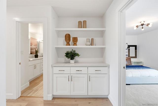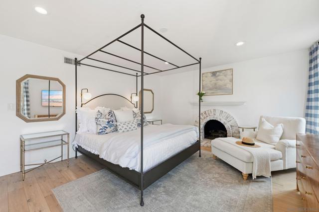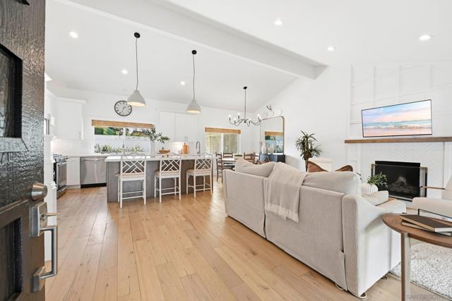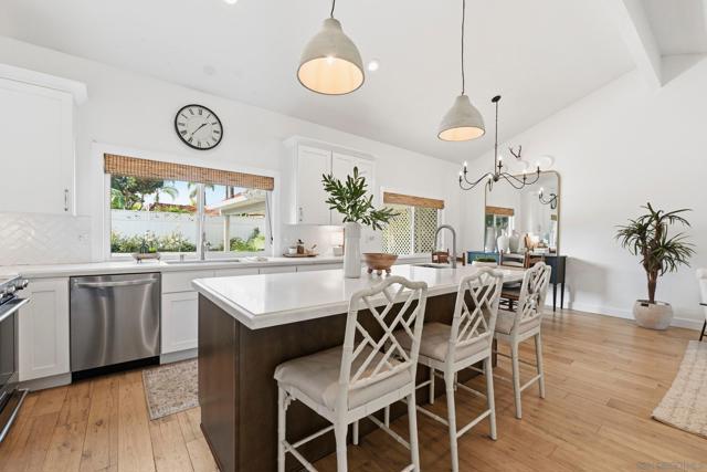 Welcome to a gracious interpretation of English cottage sensibility, this Encinitas Estates residence blends timeless beauty with effortless livability. Beautifully updated throughout, the home features custom window blinds, rich hardwood flooring, dual-pane windows, and epoxy-finished garage floors, offering both refined aesthetics and modern comfort. The home unfolds across five generous bedrooms and three beautifully appointed baths, all anchored by a thoughtfully designed open floor plan that invites both light and connection. The main living spaces are flanked by oversized windows, allowing sunlight to pour into the living room, kitchen, and dining areas, creating an atmosphere that feels both luminous and serene. Every detail has been carefully considered, from the refined upgrades throughout to the seamless flow between indoor and outdoor living. On the lower level, a private bedroom and full bath sit just beyond a separate family room, offering an ideal retreat for guests or multigenerational living. Large glass doors open to a garden sanctuary where manicured lawns, climbing white roses, magnolia, and mature cypress trees frame a setting reminiscent of the European countryside. An awning shelters the terrace for al fresco dining, making the backyard a natural extension of the home’s warmth and charm. Encinitas Estates is one of the most beloved neighborhoods, known for its festive holiday spirit and close-knit community, this home offers a rare combination of timeless appeal, modern comfort, and an inviting setting for both everyday living & memorable entertaining.