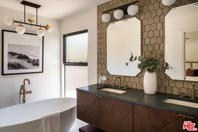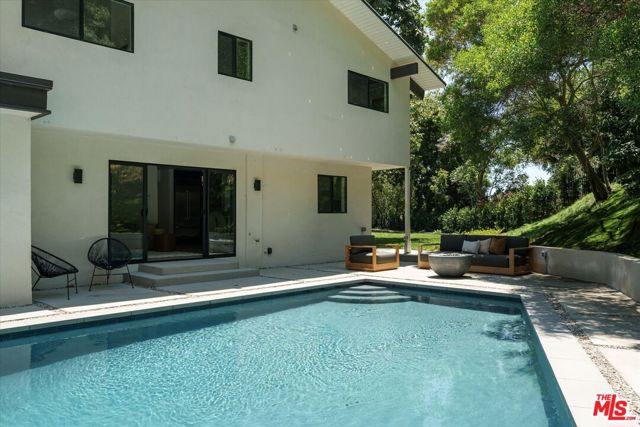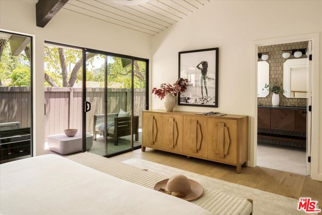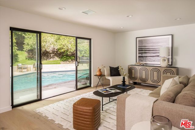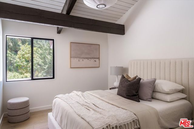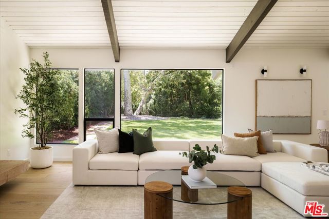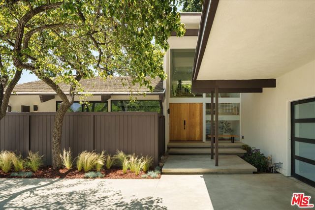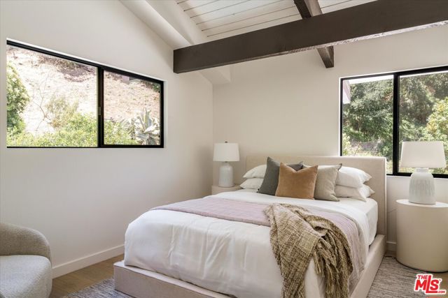 FOR LEASE OR SALE! Quiet and peace is what you'll find tucked at the end of a long, gated drive on a generous flag lot in the Brentwood Hills section of Mandeville Canyon. This down-to-the-studs mid-century modern remodel is a study in quiet luxury and thoughtful living. Surrounded by hedges and flanked by your own private hillside, the property offers a sense of seclusion that's rare especially just minutes from Sunset Blvd. Vaulted ceilings create openness throughout. Two bedrooms are on the main floor, including the primary with luxurious en-suite bath and its own private patio, perfect for a morning coffee. The second features its own en-suite bath, making it an ideal guest suite, home office, or creative studio. Upstairs, three additional bedrooms & 2 full baths, plus a loft-style den create space for work, guests, study, or media. The home's scale is human, but the lot is expansive, allowing indoor and outdoor living to coexist with ease. Two large yard spaces create natural zones for entertaining. On the side, a wide flat lawn opens off the living and dining rooms, perfect for outdoor dinners, a volleyball or soccer game, or just relaxing. In the back, a totally renovated pool and patio connect to the kitchen and den, set against the hillside for added privacy. New systems including three zone HVAC, tankless water heaters, and appliances by Wolf, Cove, and Sub-Zero bring comfort and convenience, while wide-plank European oak floors and clean, classic finishes keep the look grounded and timeless in mid century detail. Designer finishes and thoughtful selections throughout reflect the care that went into crafting the updated version of the home. There's ample parking both behind the gate and curbside on the neighborhood's wide streets, where underground utilities keep sightlines clear and the environment uncluttered. For those who love the outdoors, the nearby Westridge Trailhead offers a local escape with canyon paths and sweeping ocean views, perfect for morning hikes, dog walks, or just clearing your head. Within the boundaries of highly regarded public schools (Kenter Canyon Elementary, Paul Revere Middle and Palisades High School) and close to some of LA's most sought-after private campuses, this location blends the best of quiet canyon living with access to everything the Westside has to offer. Minutes from Amici, Brentwood Country Mart, the farmer's market on Graetna Green as well as the shops on Montana in Santa Monica. Originally built as the model home for the neighborhood in the early 1960s and held by the same family ever since, it's been expanded and reimagined for modern living. Though rooted in history, the home feels brand new. Only the mature trees, original MCM design, and wood-burning fireplace hint at the eras of days gone by. It's truly the best of both worlds: classic mid-century Brentwood with all the comforts and confidence of new construction. Floorplan measured by Cubi Casa. Presumed accurate but not guaranteed.