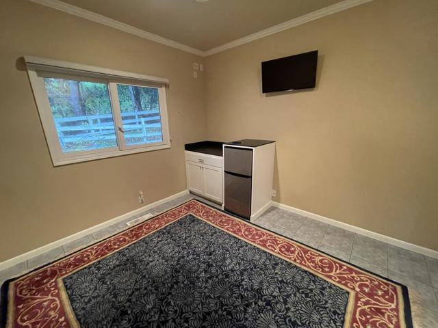 Private guest room in a detached structure on the property, offering complete separation from the main home and a high level of privacy. Surrounded by a peaceful setting, this space is ideal for a Silicon Valley commuter looking for a quiet, comfortable place to stay. Includes a bedroom and private bathroom. No kitchen or laundry access; mini fridge and microwave available. Square footage is approximate.