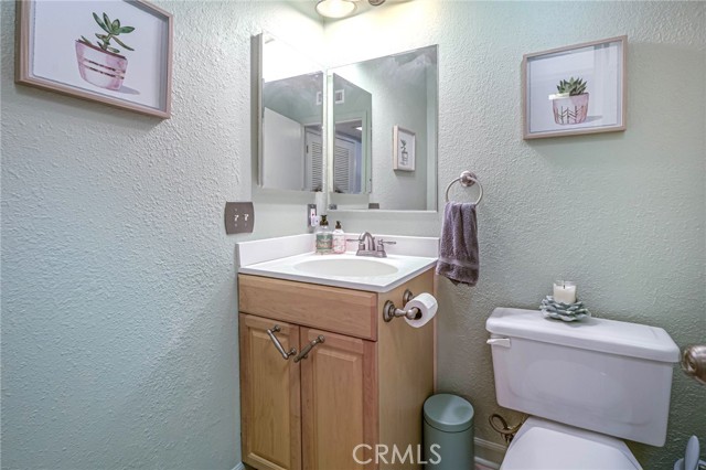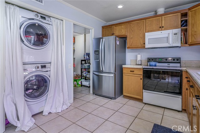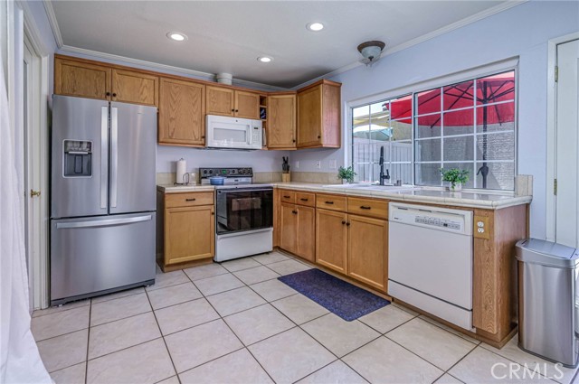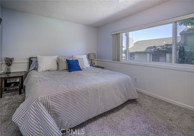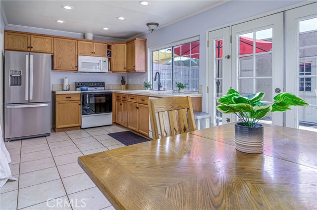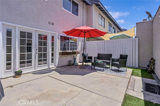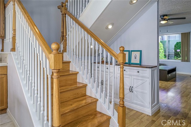 Welcome to this spacious 4-bedroom, 2.5-bathroom attached single-family home in the highly desirable Corsican Villas community of Brea. Offering 1,469 square feet of comfortable living space, this well-maintained residence features a convenient downstairs bedroom with a closet, a generous kitchen with abundant cabinetry, recessed lighting, crown molding, a large walk-in pantry with built-in shelving, and an inside stacked laundry closet. French doors off the kitchen open to a private patio that leads directly to the two-car garage. A newly added built-in storage cabinet at the base of the stairs enhances the home’s already impressive storage options. Upstairs, you'll find three additional bedrooms, including a spacious primary suite with dual closets, elegant wainscoting, and an en-suite bathroom with a large walk-in shower. The hallway bathroom features a deep jetted tub/shower combo. Most rooms are equipped with ceiling fans, and the home includes dual-paned windows on most windows. Downstairs flooring is a mix of easy-care tile and laminate, while the upstairs bedrooms feature newer carpeting. Residents enjoy access to two gated community pools, wide streets, and lush greenbelts—all with one of the lowest HOA fees in the area. Ideally located near top-rated schools, shopping, and dining, this move-in-ready home is a true gem!
