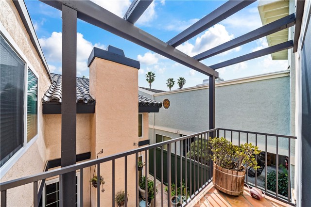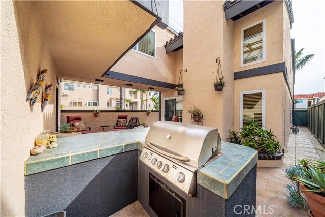 Sophisticated coastal living meets timeless architectural character in this thoughtfully maintained Huntington Beach single-family residence, offering three bedrooms, a spacious loft, and two-and-a-half baths, ideally located just minutes from the beach, the pier, Huntington Dog Beach, and Main Street. Set on a corner lot, the home enjoys enhanced privacy and abundant natural light, framed by low perimeter walls that create a serene, semi-private courtyard ideal for outdoor living. The exterior reflects a Spanish-inspired Mediterranean aesthetic with stucco finishes, wrought iron detailing, and a fire-resistant tile roof replaced in 2012–2013, along with significant structural improvements completed at that time. Additional upgrades include a landscape redesign (2017–2018), Ledgestone cultured stone pillars (2023), and recent exterior painting (2022 and 2024), reinforcing curb appeal and durability. The 2,328-square-foot interior blends classic materials with functional spaces, featuring Spanish terracotta tile and hardwood floors (installed in 2009 with new subflooring), custom sliding closet doors, shutters, and a wrought iron staircase. Dual-pane windows with UV-protective film enhance comfort and energy efficiency. The kitchen features pine cabinetry and tile surfaces, opening to outdoor entertaining areas. The main living space includes a gas fireplace, surround sound wiring, and a modern ADT security system (2023). Upstairs, the primary suite opens to a private balcony overlooking the courtyard, complemented by a versatile loft. Laundry is conveniently located upstairs. Outdoor living includes a covered patio, built-in masonry BBQ island, multiple seating areas, decorative patio lighting (2025), and mature fruit trees. Energy-efficient upgrades include low-flow toilets (2025) and reverse osmosis filtration (2024). Additional highlights include a two-car garage, 2019 water heater, newer screens, and a low-maintenance 2,938-square-foot lot. Major systems have been proactively addressed, reflecting consistent ownership. A rare opportunity to own a detached coastal home combining architectural depth, documented improvements, indoor-outdoor living, and a highly walkable Huntington Beach lifestyle.