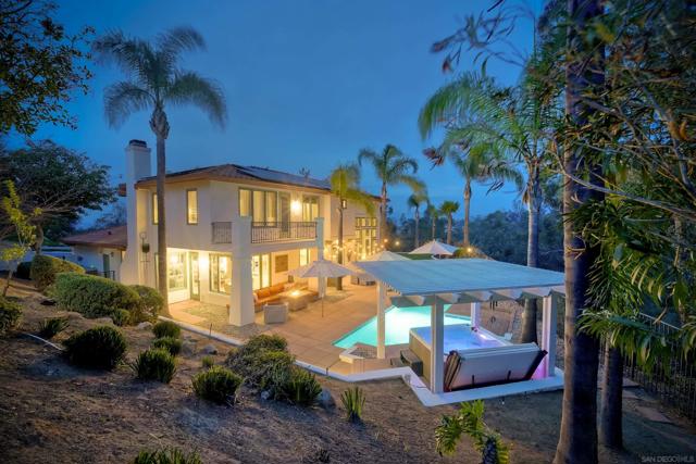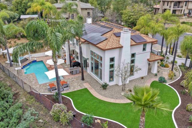 Nestled within the gated community of Mt. Woodson's exclusive north side, this executive home is situated on a corner lot at the end of a quiet cul de sac. Featuring one the most desirable floorplans & overlooking the golf course this home is a dream inside and out. Drawn to the home by the landscape design that provides the finest in curb appeal, the open floor plan offers 3 bedrooms w/an optional 4th bedroom, currently used as an office, 3 full bathrooms & an oversized 3-car garage. Upon entering, an impressive 20-foot ceiling adorns the living room framed on an impressive wall of windows with views of the surrounding mountains. Adjacent, the light filled dining rooms French doors open to the expansive, thoughtfully designed, fully fenced & professionally landscaped backyard. The tranquil outdoor living space features a pool w/water features, jacuzzi under a new aluminum gazebo & turf grass area set upon the fairway of Hole #4. Inside, a bright & updated kitchen w/stainless steel appliances & quartz counter tops opens to a breakfast nook & the family room. The main floor also features an office, full bathroom & laundry room off the attached garage. Upstairs, the primary en suite features a private balcony, luxurious bathroom w/dual vanity sink, glass enclosed shower, garden tub & walk in closet. 2 additional bedrooms & 3rd bathroom complete the upstairs. Energy cost savings w/an owned solar system plus a 4-battery backup system installed in 2021, whole house fan, new heating & air conditioning system in 2021 & new Boral Steel stone coated roof system in 2020. The gated, award winning, Mt. Woodson community is located 3.5 miles east of Poway Rd. and was created around the historic Amy Strong Castle and the Mt. Woodson golf course. Located on the coveted "West-End" of Ramona, this lovely home is a short drive to both Ramona and Poway, hiking and nature preserves, local wineries and Mt Woodson Elementary. Located far enough outside the city to provide space, privacy and quiet but close enough for commuting. Mt Woodson was developed by Davidson Homes in the 1990s.