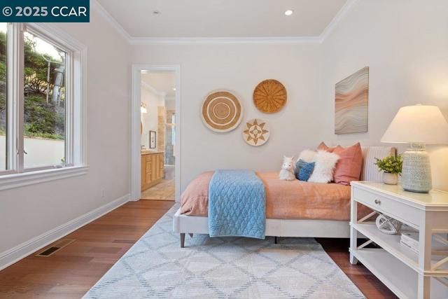 This Mediterranean-style retreat sits peacefully on a quiet street between downtown Orinda and Miramonte High School. A manicured garden and warm Brazilian cherry staircase lead to the main level, where natural light fills the open-concept living and dining spaces. The expansive living/family room—spanning 520 sq ft under a coffered ceiling—features a wet bar, wine cellar, grand fireplace, and direct deck access for easy entertaining. The gourmet kitchen offers Sub-Zero and premium appliances, granite counters, a large island, and breakfast bar seating for four, opening to a side deck and outdoor kitchen. Upstairs, three ensuite bedrooms include a luxurious primary suite with panoramic views, a coffered ceiling, and a fireplace. A convenient laundry room and covered garden deck complete the level. A fourth bedroom with a full bath on the entry level provides privacy for guests. Conveniently located near Moraga Road, with quick access to Highway 24, BART, and top-rated Orinda schools—this home offers elegant living in a prime location.