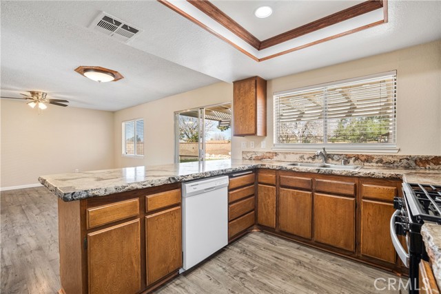 Move-in ready 3-bedroom Westside home with a huge, park-like backyard and paved RV access, tucked in a quiet, peaceful neighborhood with gorgeous curb appeal and professionally landscaped front and back yards. This meticulously maintained home shines with newer interior paint, a newer roof, newly remodeled bathrooms, newer luxury vinyl waterproof flooring, and newer carpet in the bedrooms. Inside, the living room features vaulted ceilings and a cozy fireplace. The spacious kitchen offers newer LED lighting and custom Stone Crafters countertops, and opens to the family room with built-ins—ideal for everyday living and entertaining. Step outside and unwind in your private, oversized backyard with a covered patio, additional side covered patio, paved RV access, plenty of grass, a river rock bed, and mature trees that provide exceptional privacy. A storage shed with electrical adds extra function for hobbies, storage, or a workshop setup. Centrally located near schools and shopping and just minutes to the freeway—this home is a must-see. Bonus: new garage door, and the refrigerator, washer, and dryer are included, offering great cost savings for the new owner.