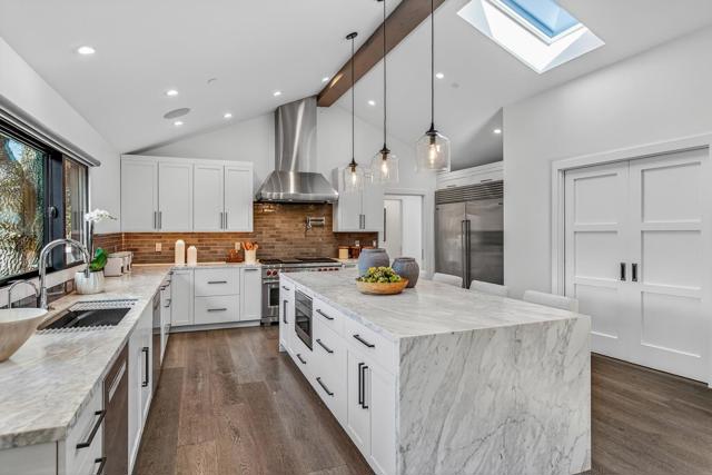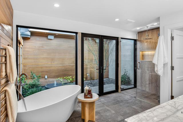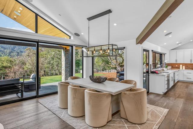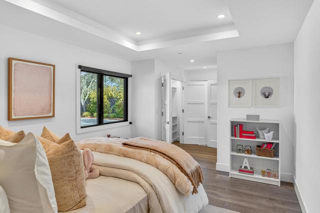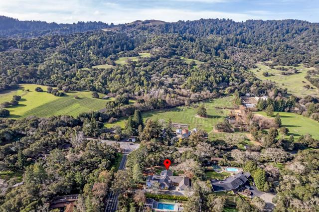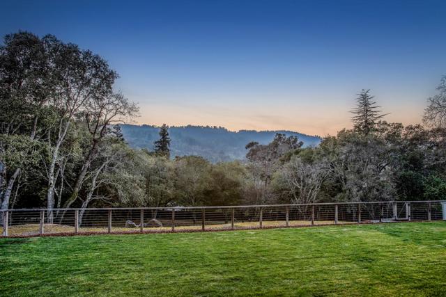 Contemporary single-level main residence with attached two-story ADU on 1.1+ private acres finished in 2021, offering direct Windy Hill views and walking distance to Portola Valley Town Center, library, restaurants, farmers market, and trailheads. Striking modern architecture features walls of glass, soaring ceilings, skylights, and white oak floors throughout. The dramatic great room opens to covered and open terraces and a level lawn just off the living room patio, with rear grounds anchored by a heritage oak. The designer kitchen showcases Calacatta marble surfaces, a waterfall island, and high-end appliances. The main residence includes a dedicated office, four bedrooms, and three and a half baths, highlighted by a serene primary suite with Windy Hill views and a Zen-inspired bath with private garden. A privately located bedroom suite is ideal for guests or an au pair. The attached ADU offers one bedroom, one bath, a full kitchen, and a living room with fireplace, with finishes matching the main home. Gated entry, custom pavers, cedar entry door, fountains, mature landscaping, level synthetic lawn, raised garden beds, and fully fenced grounds complete this rare blend of architectural sophistication, privacy, walkable convenience, and iconic hillside scenery.