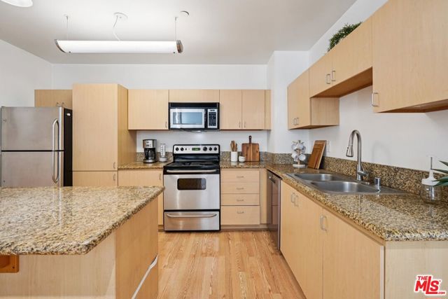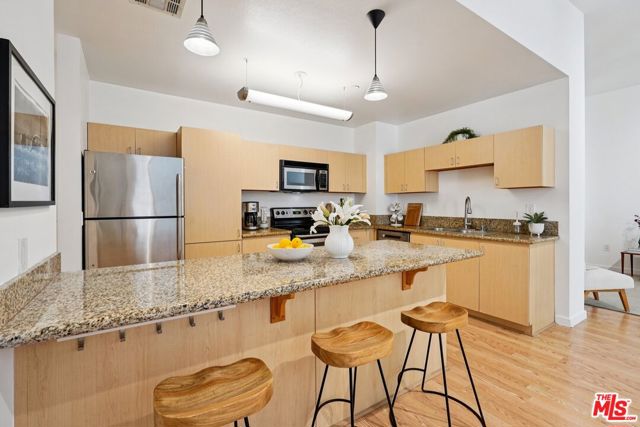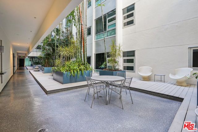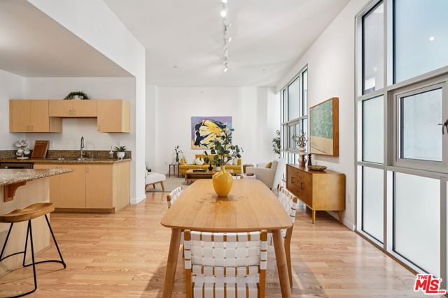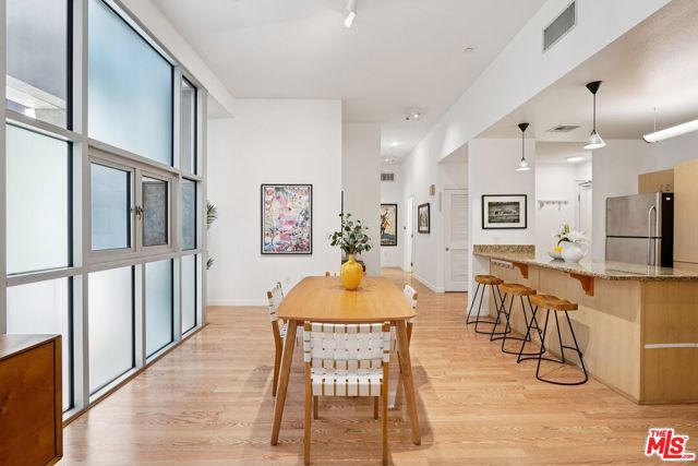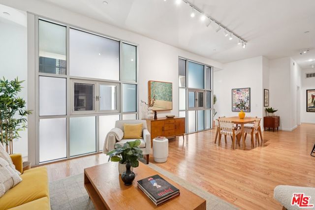 A well-designed 5th-floor residence at Library Court, featuring the tallest ceiling height in the building at over 10 feet. Expansive glass wall systems and oversized windows introduce abundant natural light while creating a strong sense of volume throughout the home. The oversized living and dining areas open into a broad, flexible entertaining space ideal for hosting, art display, or live/work use.The open kitchen is thoughtfully integrated into the main living area and offers granite countertops, stainless steel appliances, ample cabinetry, and a large island with breakfast bar seating. On the opposite side of the residence, two fully enclosed bedrooms are privately situated away from the common areas, each with high ceilings, plush carpeting, and large windows framed by the building's signature glass panels that provide soft, diffused light and privacy. The primary suite features dual closets and a private en-suite bath. Additional highlights include in-unit stacked laundry, newer plumbing upgrades, direct-access water shut-off valves, and two parking spaces. Library Court is a distinctive mid-century office conversion offering a Zen bamboo courtyard, fitness center, business lounge, game room, and a 24-hour attended lobby, all in a prime Financial District location near the Los Angeles Central Library, FIGat7th, Metro lines, Whole Foods, and acclaimed dining.