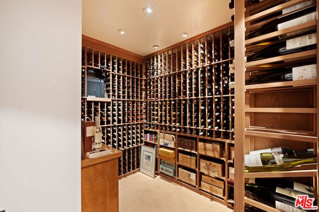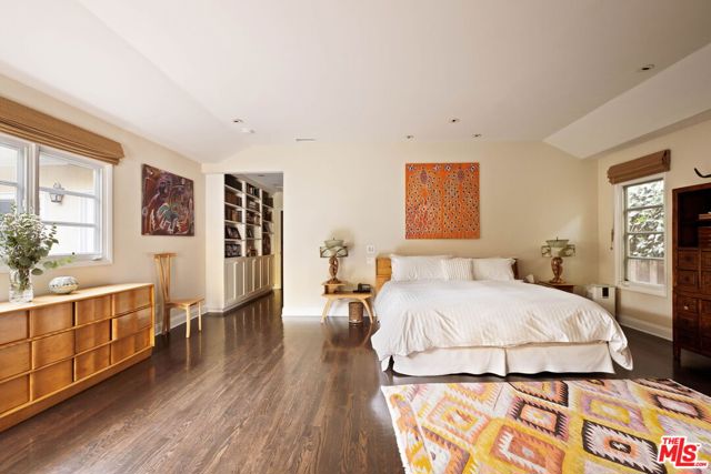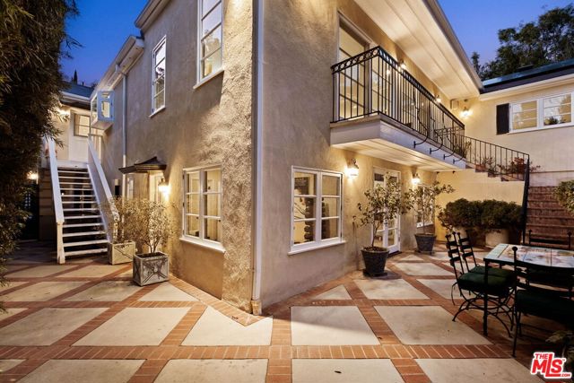 Gated 1948 Traditional-style home with 5 bedrooms and 5 baths on nearly half an acre in a serene, park-like setting in the Lower Bird Streets north of Sunset. Exceptionally private, meticulously maintained, and extensively updated, the property is ideal for year-round indoor/outdoor entertaining. A wraparound porch overlooks the lush, secluded flat front yard. The front door opens to a black-and-white marble foyer and expansive living room with bay window, crown molding, and antique French marble wood-burning fireplace. The formal dining room with wainscoting and pocket doors opens to the family room featuring a second wood-burning fireplace with antique mantel, built-ins, and bookshelves. A breakfast bar and informal dining area flow into the large chef's kitchen with professional appliances and walk-in pantry. Windows and French doors throughout provide abundant light and backyard views. Off the kitchen is a separate guest or staff suite with ensuite bath and walk-in closet, plus adjacent laundry room. A central hall with powder room leads to the private primary suite with cedar-lined walk-in closet and bath with soaking tub and heated floors. Two additional generously sized bedrooms, one with built-in desk and shelving, share a full bath. The lower level with separate entrance offers flexible use as an office, bedroom, gym, screening room, guest and/or staff quarters, with ensuite bath, plus a temperature-controlled 1,500-bottle wine cellar, and large storage room. The exceptional deep lot is framed by mature trees and gardens and features a large swimmer's pool, lounge, and outdoor dining areas. Major NEW upgrades include a dual high-efficiency heat pump HVAC system and ducting, flame-retardant/cool roof, 400-amp electrical service, whole-house solar, tankless water heater, pool equipment, dual level 2 EV chargers, and drought-resistant landscaping. Warm, refined, and impressively private, just minutes to studios, dining, shopping, and West Hollywood Elementary.