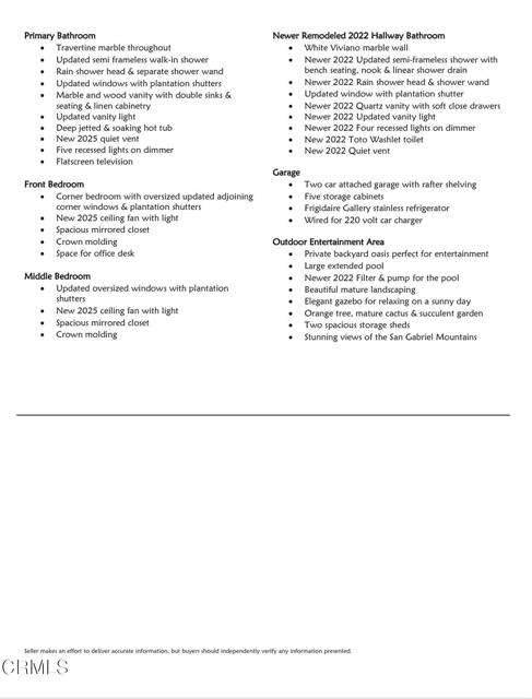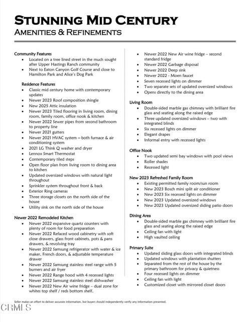 Step into this exceptional mid-century residence nestled in the heart of coveted Hastings Ranch, where iconic architectural lines have been thoughtfully elevated with refined, contemporary upgrades. Designed for both grand entertaining and everyday comfort, the home immediately impresses with a spacious living room anchored by a striking marble fireplace, recessed lighting, and a picturesque bay window that fills the space with natural light and timeless elegance.At the heart of the home is the stunning chef's kitchen, a true showpiece featuring premium stainless steel appliances, expansive quartz countertops, custom-designed cabinetry, and dual wine refrigerators--perfect for hosting in style was updated 2022. The kitchen flows effortlessly into the dining area, highlighted by soaring vaulted ceilings and a built-in office nook overlooking the pool and lush gardens, blending function with inspired design. The family room offers a wall of windows framing serene pool and garden views, recessed lighting, its own split-system air conditioning, and direct access to the outdoor entertaining areas was refreshed in 2023.The luxurious primary suite is a private retreat, complete with a large custom closet, recessed lighting, ceiling fan, and direct access to the pool. The spa-inspired primary bath indulges with a jetted soaking tub featuring a built-in flat-screen TV, a spacious walk-in shower, and dual vanities. Two additional generously sized bedrooms feature new ceiling fans and plantation shutters, while the beautiful hallway bath elevates the experience with marble finishes, an oversized shower with seating and niches, a newer vanity, and a Toto Washlet bidet was renovated in 2022.Outdoors, the home truly shines, embracing the best of the California lifestyle. The backyard is an entertainer's paradise with a generous swimming pool, a charming trellis ideal for alfresco lounging, and a tiki-themed succulent garden that perfectly complements the home's mid-century aesthetic. To top it off, enjoy sweeping views of the San Gabriel Mountains while lounging in the pool.Additional highlights include updated windows, recessed lighting, crown molding throughout, and abundant storage. This remarkable property offers multiple spaces to relax, work, and entertain, making it far more than a home--it's a lifestyle opportunity. Experience refined mid-century living at its absolute best.