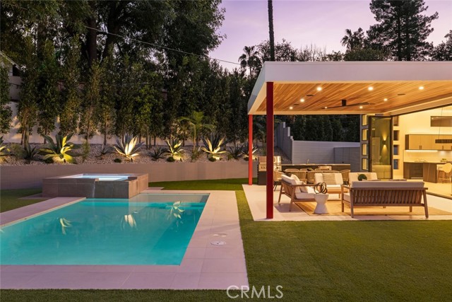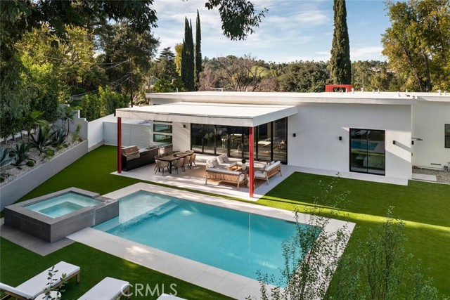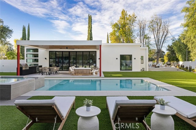 A rare opportunity to lease a fully reimagined single-story home on a flat lot in Woodland Hills! This stunning 3-bedroom, 3-bathroom residence offers 2500 square feet of meticulously redesigned living space, rebuilt from the ground up to deliver modern luxury at every turn. Soaring 13-foot ceilings throughout the home create an airy, expansive atmosphere throughout, while the seamless indoor-outdoor design blurs the line between interior comfort and alfresco living. The custom kitchen features built-in appliances and flows effortlessly into the entertaining spaces, making it ideal for hosting. Smart home technology elevates the experience with whole-home Hue lighting (inside and out), built-in sound, and electric blinds—adjust the ambiance with the touch of a button. Each of the three custom bathrooms showcases thoughtful design and premium finishes. Outside, the nearly 16,000-square-foot lot provides rare space and privacy. Enjoy resort-style amenities including a pool, spa, and built-in BBQ—perfect for year-round outdoor entertaining. This prime Woodland Hills locale places you so close to the Valley's new central hub of dining, shopping and entertainment that Warner Center has to offer, not to mention easy freeway access, less than 30 mins to Malibu and less than 1 mile from one of the Valley's highly accredited elementary schools, Woodland Hills Charter Elementary. Home is new and no one has lived in it before. This home truly has it all and is a must see!