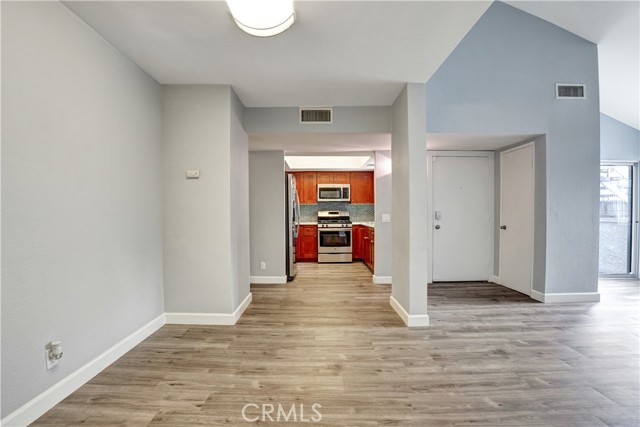 FHA Approved Townhome!!! Beautiful and renovated large two bedroom townhome features an open concept living area with high ceilings, updated kitchen, laminate flooring throughout the home, tile floors in bathrooms, fireplace, in unit laundry closet, sliding doors leading to the front patio area, and a private two car garage. The renovated modern kitchen features quartz countertops, stainless steel appliances, and custom cabinetry. Upstairs are the two spacious bedrooms with ample closet space, a laundry closet including washer & dryer, and a full bathroom with dual sinks; both bedrooms have sliding doors leading to a very large balcony with views of the mountains. The main bedroom offers a walk-in-closet, the other bedroom has mirror closet doors. The private two car detached garage is located behind the unit. The complex community is gated and includes a sparkling pool and spa, recreation room, lush landscaping, and guest parking. The home is centrally located in the heart of the San Fernando Valley, close to shopping, restaurants, transportation, and schools.