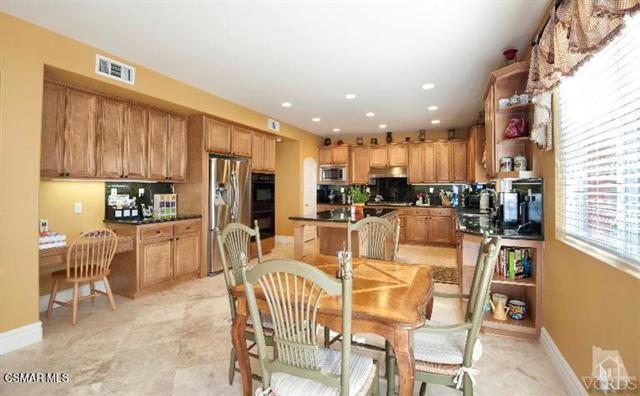 Paradise Found! A 5 bdrm 5 bath home on quiet street in Dos Vientos Ranch w/Private backyard w/oversized spa, patio and BBQ. This popular floorplan has a full downstairs bdrm suite w/full bath and walk-in closet. Travertine flooring, cathedral ceilings, and massive windows frame this home with a gorgeous central staircase. The gourmet kitchen has a very large granite island for the serious chef and family gatherings. The Viking gas range and hood compliment a new dbl oven and stainless fridge with a big pantry and gorgeous cabinetry. The kitchen adjoins the spacious family room w/fireplace and built-in oak entertainment center. Formal dining and living room including a downstairs office or den. The master features views and a cavernous spa-quality bathroom w/oversized soaking tub and a family-sized shower, dual vanities w/walk-in closet for two. Two upstairs bedrooms share a Jack & Jill bathroom and the other has it's own full bathroom ensuite. Upstairs laundry incl. newer LG Washer & Dryer w/sink and extra cabinets. The kitchen and family room open to a lush private yard w/incredible jetted spa and BBQ island, perfect for entertaining and enjoying the Mediterranean climate Dos Vientos Ranch is famous for. Three-car garage is 2 to one side w/direct access and the third is separate. Close to park, recreation center, open space, shopping and California Distinguished Sycamore Canyon K-8 School. Yes you can have it all! Call for information and appt.