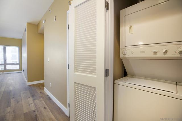 Filled with natural light, this ultimate quieter courtyard facing unit has brand new, gorgeous 8x48 LVP flooring throughout, including bathrooms and kitchen. Spacious & open floor plan with stainless steel appliances, a gas range, master walk-in closet and in-unit washer/dryer. Perfectly situated in the Gaslamp between the Marina District and East Village. Enjoy being steps away from excellent dining, shopping, the ballpark, entertainment & the bay! Gaslamp City Square amenities include a pool, spa, courtyard, bbq, community room, & fitness center.