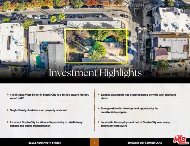 11015 Aqua Vista Street in Studio City is a 10,592-square-foot lot, zoned LAR3, that currently hosts a vacant 1,274-square-foot home built in 1908. Current ownership has obtained permits and has approved plans to demolish the structure. The offering presents the opportunity for experienced developers and investors to acquire a significant asset in one of LA's most desirable locations and develop it into a strong investment property. At the corner of Aqua Vista Street and Vineland Avenue, the location is ideal for would-be tenants due to its proximity to dining and entertainment attractions, multiple major employers, and major transportation hubs. Specifically, the site is located minutes from the 101, 134, and 170 freeways, as well as the nearby Metro B Line (Red) at the Universal / Studio City Station stop.