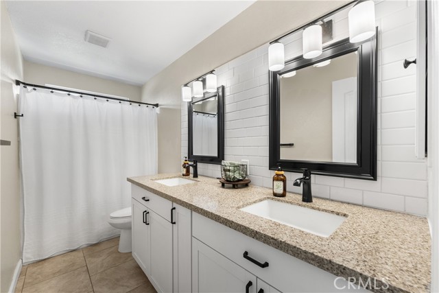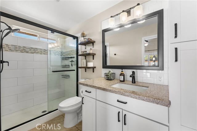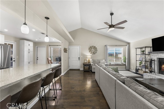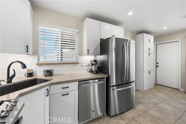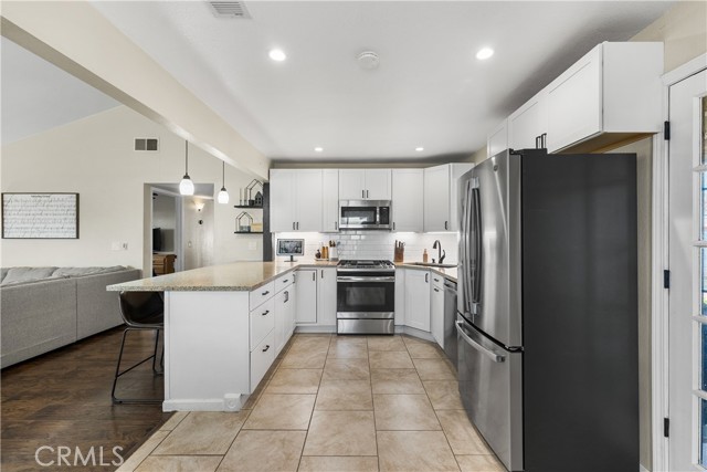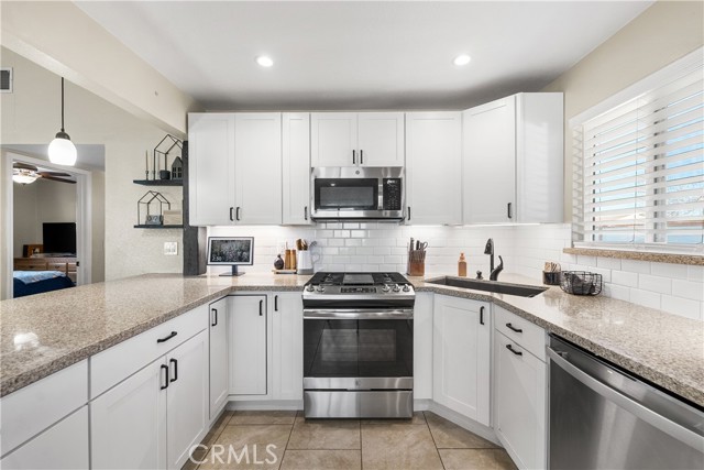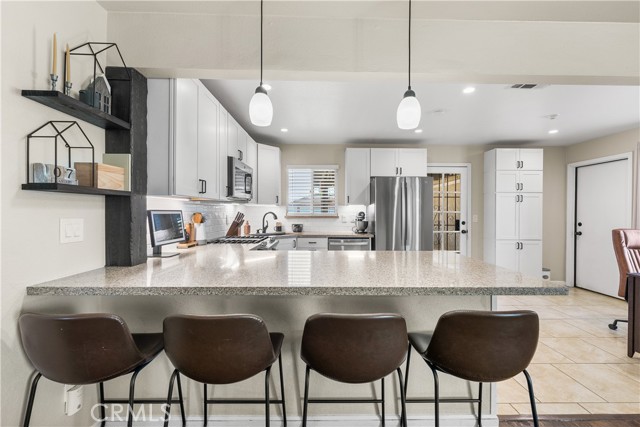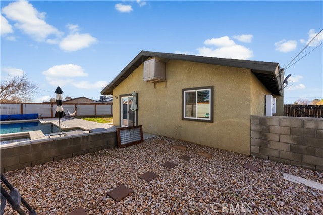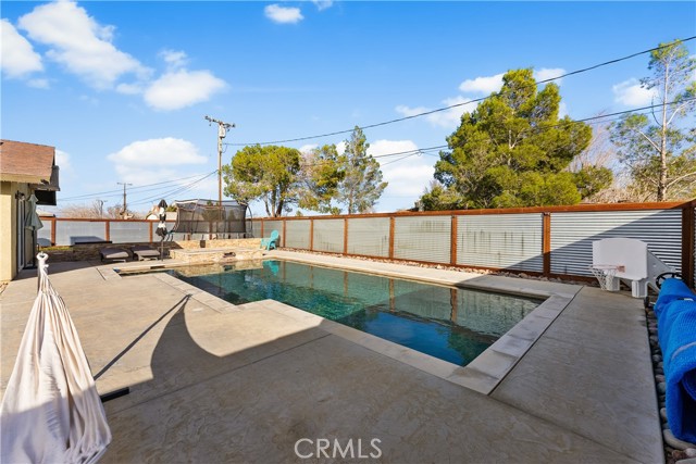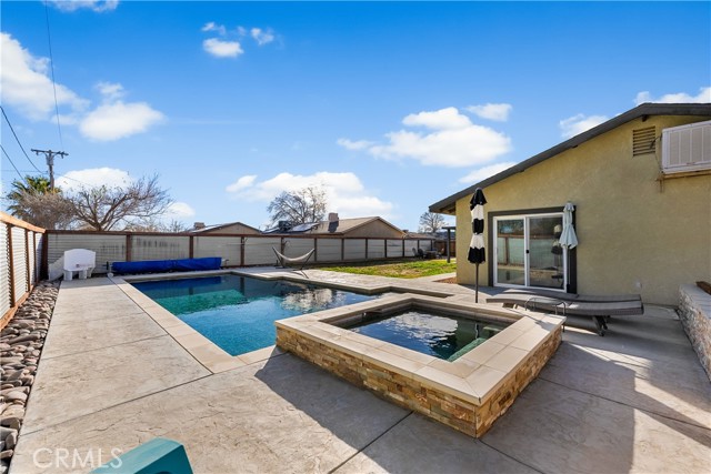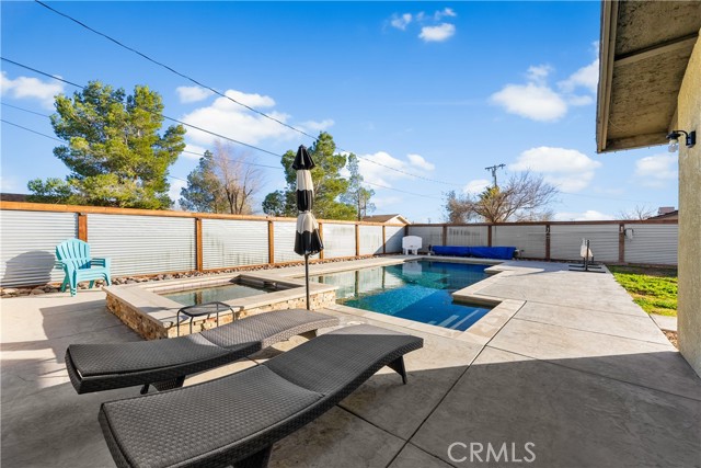 Gorgeous, fully remodeled pool home located in the heart of California City, offering stylish updates, incredible outdoor space, and modern efficiency. This 3-bedroom, 2-bathroom home has been meticulously cared for with thoughtful upgrades throughout. The remodeled kitchen is a standout, featuring updated cabinetry, custom countertops, tile backsplash, and stainless steel appliances. A breakfast bar at the island adds extra seating and functionality, while the open-concept layout allows the living room to flow seamlessly into the kitchen—perfect for hosting or everyday life. The living room is warm and inviting with a beautiful fireplace, and the home features laminate vinyl plank and tile flooring throughout for durability and easy maintenance. The primary suite includes a spacious bedroom, direct backyard access, and an en-suite bathroom with a custom-tiled shower, updated vanity, and matching quartz countertops—mirrored in the hall bathroom for a cohesive look. Outside is a true desert oasis! The custom Pebble Tec pool and spa, installed in 2020, create the perfect space to relax or entertain. A covered patio provides shade for outdoor dining, and RV access plus a custom fence offer privacy and room for all your outdoor needs. All major remodel features were completed by 2021, including windows and doors (2021) and a roof replacement (2019). This move-in-ready home is a rare find—schedule your showing today!