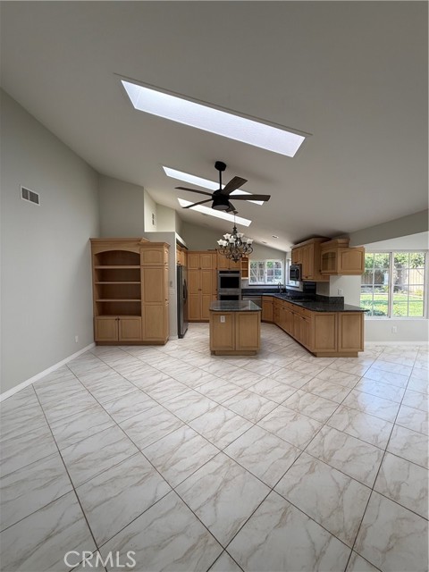 Beautiful one story 4 bedroom 2 bath home remodeled to increased square footage and to maximize natural lighting with five skylights and an open floor plan. Gourmet kitchen has a new 30 inch electric double oven with convection cooking options and new Bosch dishwasher. Additional appliances include a 5 burner gas cooktop, microwave, refrigerator with a water and ice dispenser. Cabinets are a light honey wood with dramatic dark granite countertops. Large kitchen Island perfect for baking and entertaining. Most of the house has Italian style white tile flooring with a slight marbled accent. Two of the smaller bedrooms have carpet. The master bedroom and second largest bedroom can easily fit a king sized bed. The master bath has a shower with a separate bath tub. The hallway bathroom has a shower tub combo with a two sink vanity. Some of the bedrooms have mirrored closet doors. The backyard has a pool that is shaped like a pond with pebbled coating. The pool is surrounded by mature landscaping which creates additional privacy. The plants included a variety of fruit trees including hybrid trees with multiple fruits per tree, pomegranate, pluot and plum varieties, loquat, kumquat, mint. There are also a variety of flowering plants. Stackable washer dryer located inside. Two car detached garage with EV charger and high ceilings with lots of shelves for ample storage. The neighborhood has sidewalks and street lights and is perfect for walking in the day or evening. Close to several parks, hiking trails and shopping centers with an extensive variety of delicious dining options from casual to fancy. Nearby to several gyms, yoga studios and YMCA. Short drive to the local beaches and close to several golf courses. Westlake Village is an upscale area with a warm sense of community that offers many options for an active lifestyle.