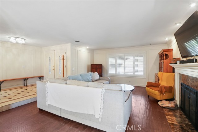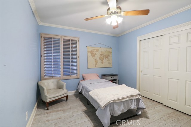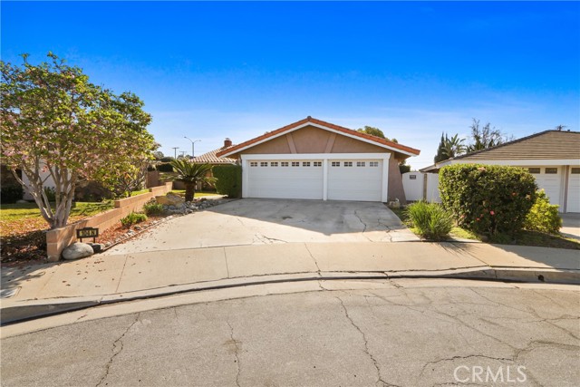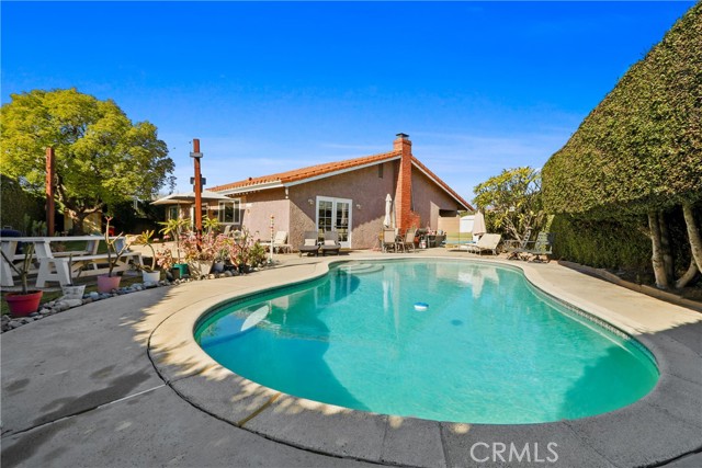 Welcome to this charming single-story home situated at the end of a desirable cul-de-sac. It boosts a welcoming double-arched entry, landscaped yard, concrete pathway, covered front porch; classic curb appeal. Inside, this 4 bedroom 2 bath offers an ideal blend of warmth and comfort. You'll find a formal entry opens to a spacious living room with bay window, shutters, crown and wall molding; a wood/gas burning fireplace for those cold nights. The living room flows seamlessly into the formal dining room. From the dining area, look out the French doors that open to the side yard displaying a large designed concrete patio and pool, perfect for outdoor dining or relaxing in your own private pool/yard. The adjacent kitchen features an extra large window(s) over the sink providing a peaceful view of the outdoor space and bringing in abundant natural light; ample cabinetry, breakfast bar, quartz countertops, full tile backsplash, stainless-steal appliances and large gas range, a spacious separate pantry, and spacious dinette room for additional dining. Conveniently there are also sliding doors at the dinette area leading to the spacious backyard where you'll find mature trees, providing privacy and a tranquil setting. Tiled throughout, recess lighting in the common areas; each bedroom has shutters and ceiling fan w/lights and double-door wall closets. The master bedroom has two mirrored sliding door closets and a separate vanity and shower area.