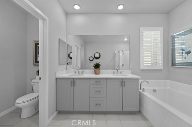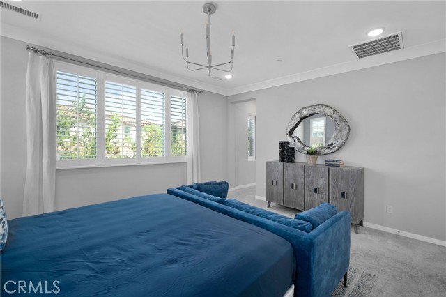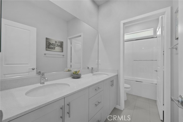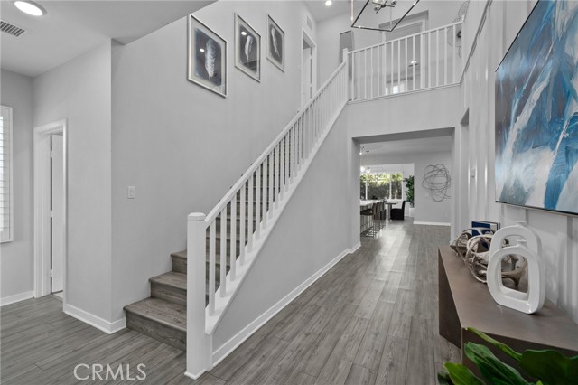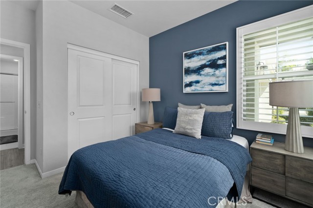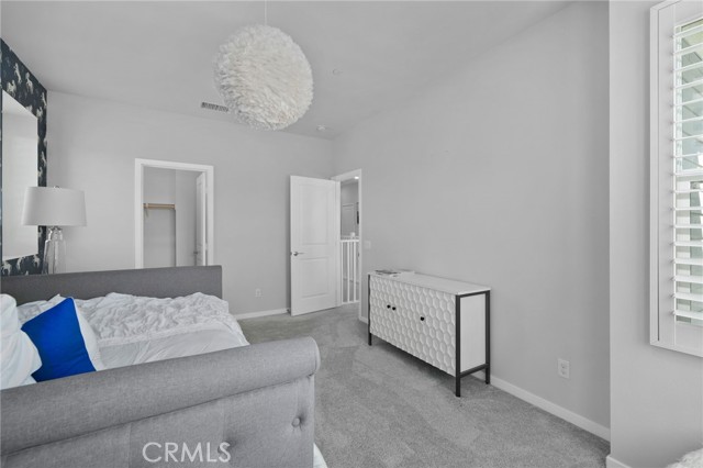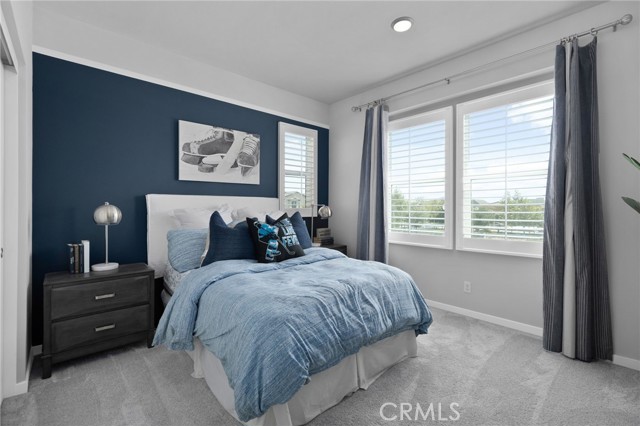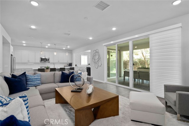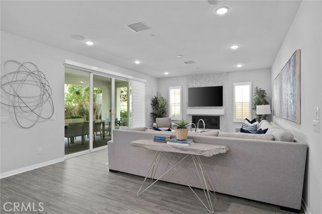 Move-in ready model home - fully furnished & upgraded! This was a new builder close out model. This 2-story home showcases an open-concept layout with soaring ceilings and elegant finishes throughout. Enjoy designer-selected upgrades including premium flooring, custom window coverings, and stylish wall décor - all included. The heart of the home features a gourmet kitchen with upgraded quartz countertops, pendant lighting, and a spacious island perfect for entertaining. Double sliding doors open to a beautifully landscaped backyard and a California Room complete with outdoor furnishings for seamless indoor-outdoor living. Relax in the great room with a cozy fireplace and custom lighting, or retreat to one of the spacious bedrooms. All bathrooms are upgraded with quartz counters, adding a touch of sophistication. The laundry room is fully equipped with upper and lower cabinetry, a large sink, and modern appliances. Additional highlights included: open staircase with elegant railing, washer, dryer, refrigerator, and television included. Prewired alarm system for added security.