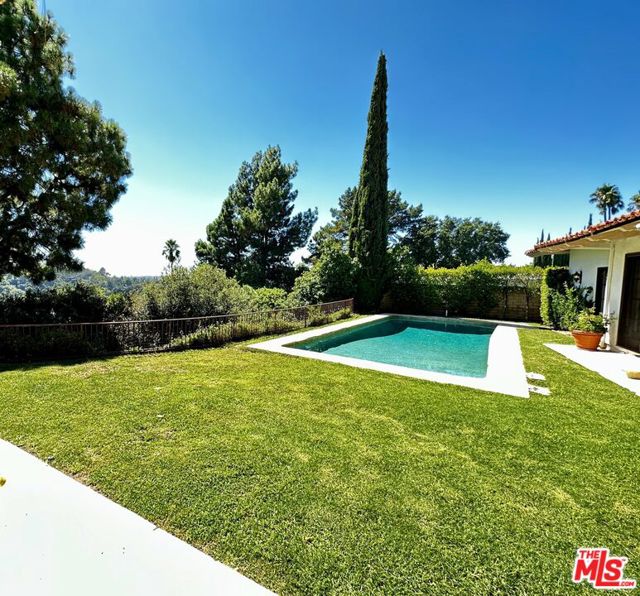 Beautiful walled and gated villa with grassy lawn, sparkling pool and expansive canyon vista. The dramatic entry leads to a formal dining room for gathering with family or friends, the Carrera marble center island chef's kitchen, elegant living room and family room for entertaining and relaxing. Gorgeous dark hardwood floors grace the interior of the home, creating an atmosphere of refinement. The main bedroom wing features a sophisticated master suite and two additional well-proportioned bedrooms sharing a tastefully redone bath. A private fourth bedroom or maid's quarters is located off the kitchen. Enjoy the ease of single story living on a quiet cul de sac. Feel like you are living in the European countryside. Includes extra refrigerator in garage, washer and dryer, Ring doorbell and cameras present.