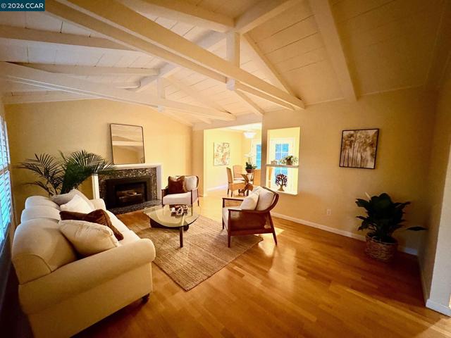 This home is a calm botanical oasis where you can sit poolside and enjoy nature. Relax in a serene garden with professionally designed landscaping for both beauty and easy maintenance. Featuring three comfortable bedrooms and custom closet organizers. The updated bathroom includes new fixtures, lighting and heated towel rack- a little luxury for those chilly mornings. The bright living room boasts vaulted wood beam ceilings marble gas fireplace and dining room that opens directly to the yard through dual French doors. Original hardwood floors, new designer paint and plantation shutters throughout. Located in the Orchard Glen neighborhood of Walnut Creek. Just a short walk to top-rated schools, local parks, hiking trails. Larkey Swim Club, shopping and dining at Palos Verdes Mall, Lunardi’s, Market on Larkey, Larkey Park, famous for its community vibe and splash pad, and so much more!