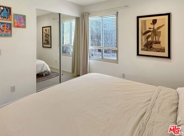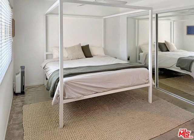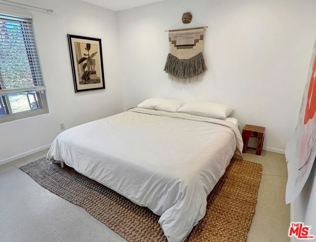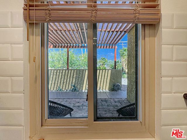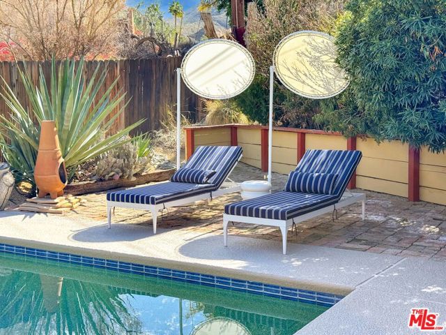 This retreat for creatives is ideally located high up in the Cove and situated on a rare, large private lot, discreetly tucked away from view via a private drive. The fully fenced property offers majestic mountain views and exudes a rural feel, yet is just minutes from shops and restaurants. The home features owned solar, as well as a resort-style PebbleTec pool and spa, perfect for relaxation. There is also a two-car garage, along with ample space for a vintage trailer, RV, future addition, and an ADU or guest house. Interiors boast a pared-down aesthetic with concrete floors and whitewashed walls, providing a neutral backdrop for art and furnishings. The open and airy living room features high ceilings, while the kitchen boasts stone countertops and all appliances, including a built-in microwave. The primary bedroom overlooks the pool and connects to an ensuite bath that opens to the pool area, while the two guest bedrooms share a bathroom. Whether entertaining on a grand or intimate scale, this rare and private property is designed for memorable desert living. You own the land, and there are no HOA fees!